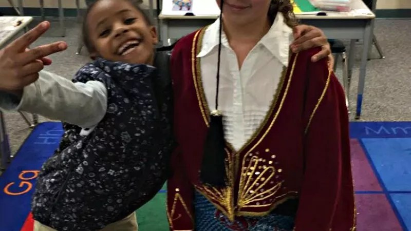 Yevaeh Patrick-Moon with her second-grade teacher, Ellie Roberts.