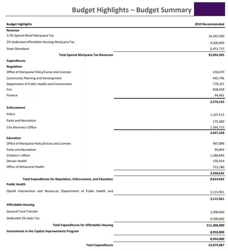 In November 2013, Denver residents voted to impose a special 3.5 percent retail marijuana sales tax to fund the enforcement and regulation of the retail marijuana industry to fund education and public health programs associated with marijuana consumption; and “to otherwise pay the expenses of operating and improving the city and its facilities.” In addition to the city’s voter-approved 3.5 percent special retail tax, the state also imposes an added tax on retail marijuana and distributes a portion, known as the State Shareback, to jurisdictions that collect retail marijuana tax revenue.