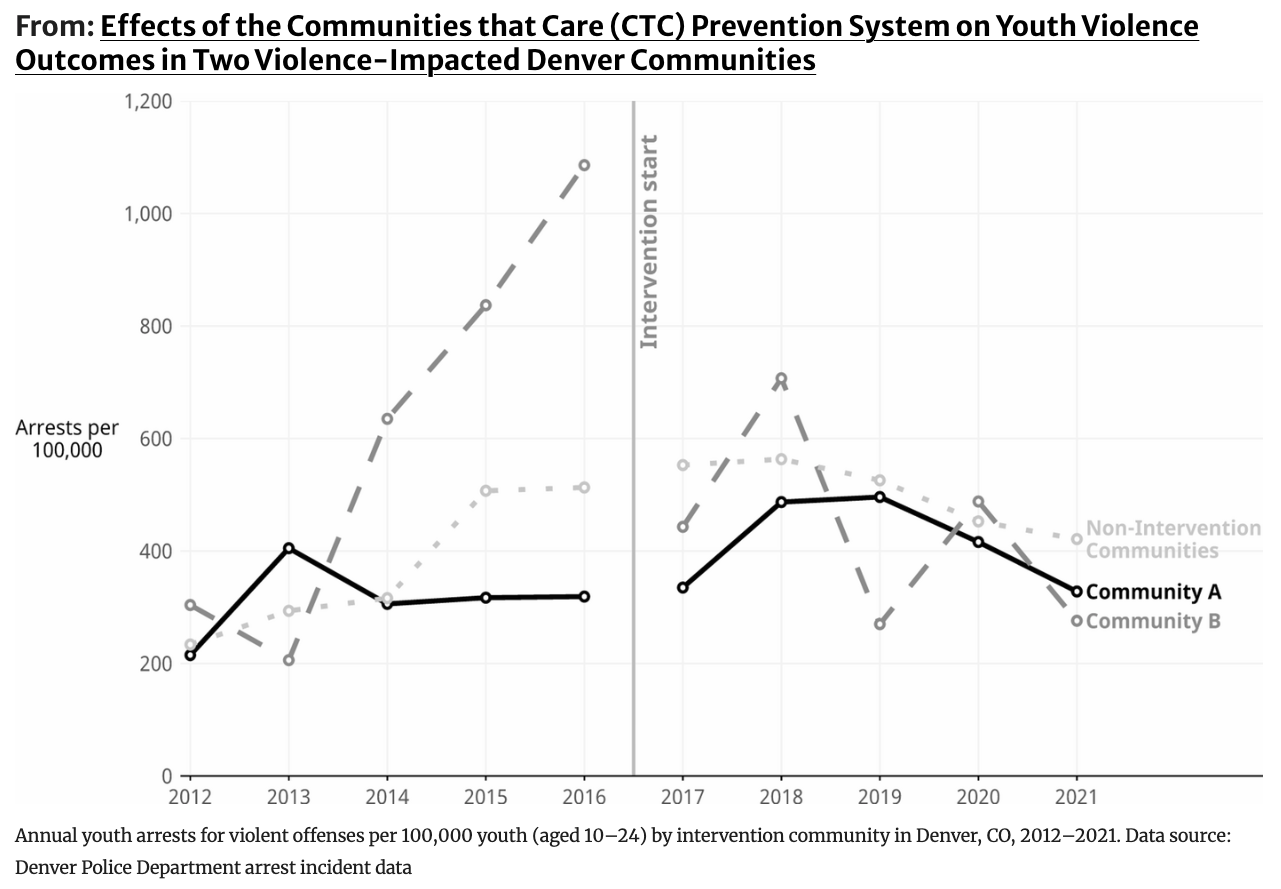 That change brought Northeast Park Hill’s youth arrest rate from more than double the city average in 2016 (513 per 100,000), to significantly below the city average in 2021 (421 per 100,000). Researchers believe the primary reason for the neighborhood’s success is community programming led by the Youth Violence Prevention Center.