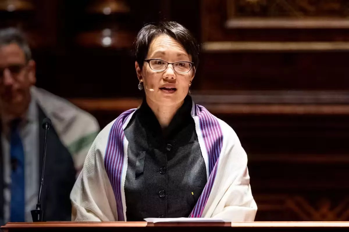 Many other Asian American Jews are children of one Jewish parent and one non-Jewish Asian parent – like Angela Buchdahl, the Korean American rabbi of New York City’s Central Synagogue. Buchdahl has an Ashkenazi Jewish father, meaning that his ancestors came from Central or Eastern Europe, and a Korean Buddhist mother. Rabbi Angela Buchdahl speaking at an interfaith prayer vigil. Michael Brochstein/SOPA Image/Light Rocket via Getty Images