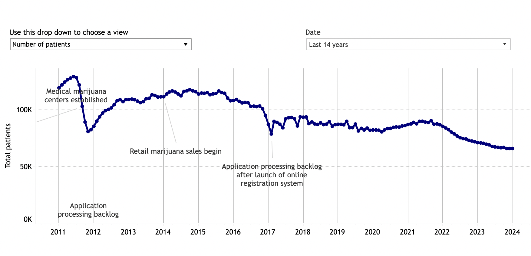 I find it incredible that the state is going to increase fees at a time when the economy is struggling and patients are struggling financially and with a broken health care system. Medical marijuana is struggling to survive and losing patients for many reasons. All of this adds up to people at the state wanting to end medical marijuana in the name of the dollar. Dispensaries have been faced with the decision to continue helping medical patients or shutter the dispensary and move everyone toward recreational marijuana. This, too, is motivated by money. The state has made it more difficult for medical dispensaries to survive, which results in fewer medical options for patients. Medical marijuana patient count in Colorado as of January. Colorado State Department of Public Health & Environment