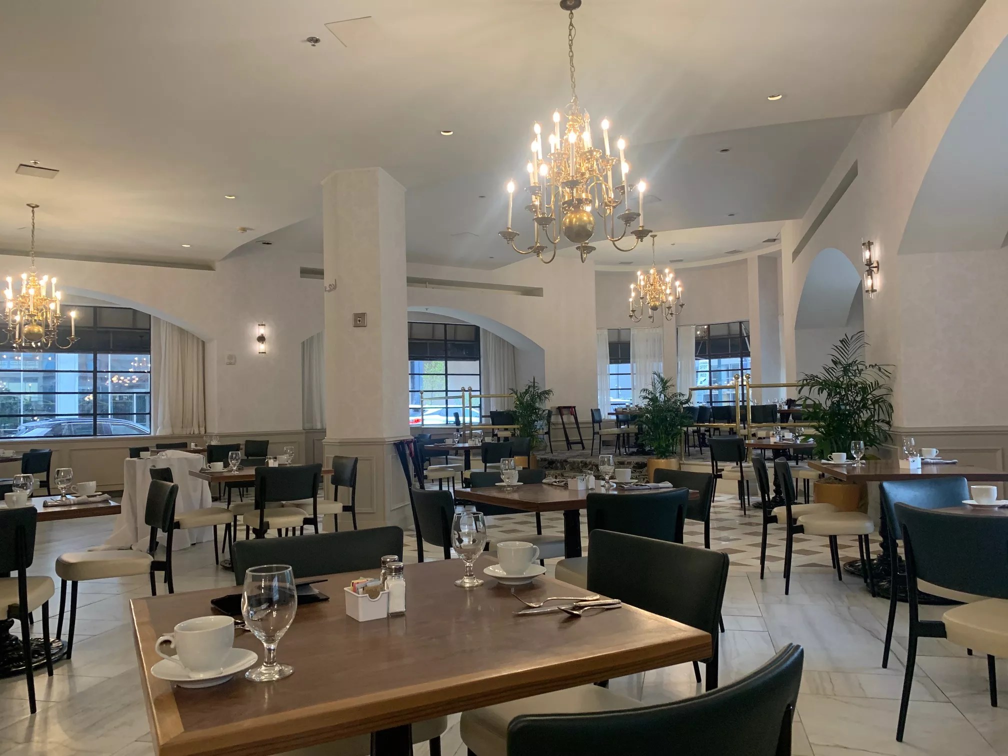 Although the Palace Arms will be empty, the Bridgerton event is slated for Ellyngton’s, the restaurant in the corner of the hotel that recently reopened after a major renovation. While the laminated tables and metal chairs don’t speak of Regency England, there’s plenty of marble — so much that the room serves almost as an echo chamber rather than the carpeted, if somewhat shabby, scene of so many past power breakfasts and lunches.