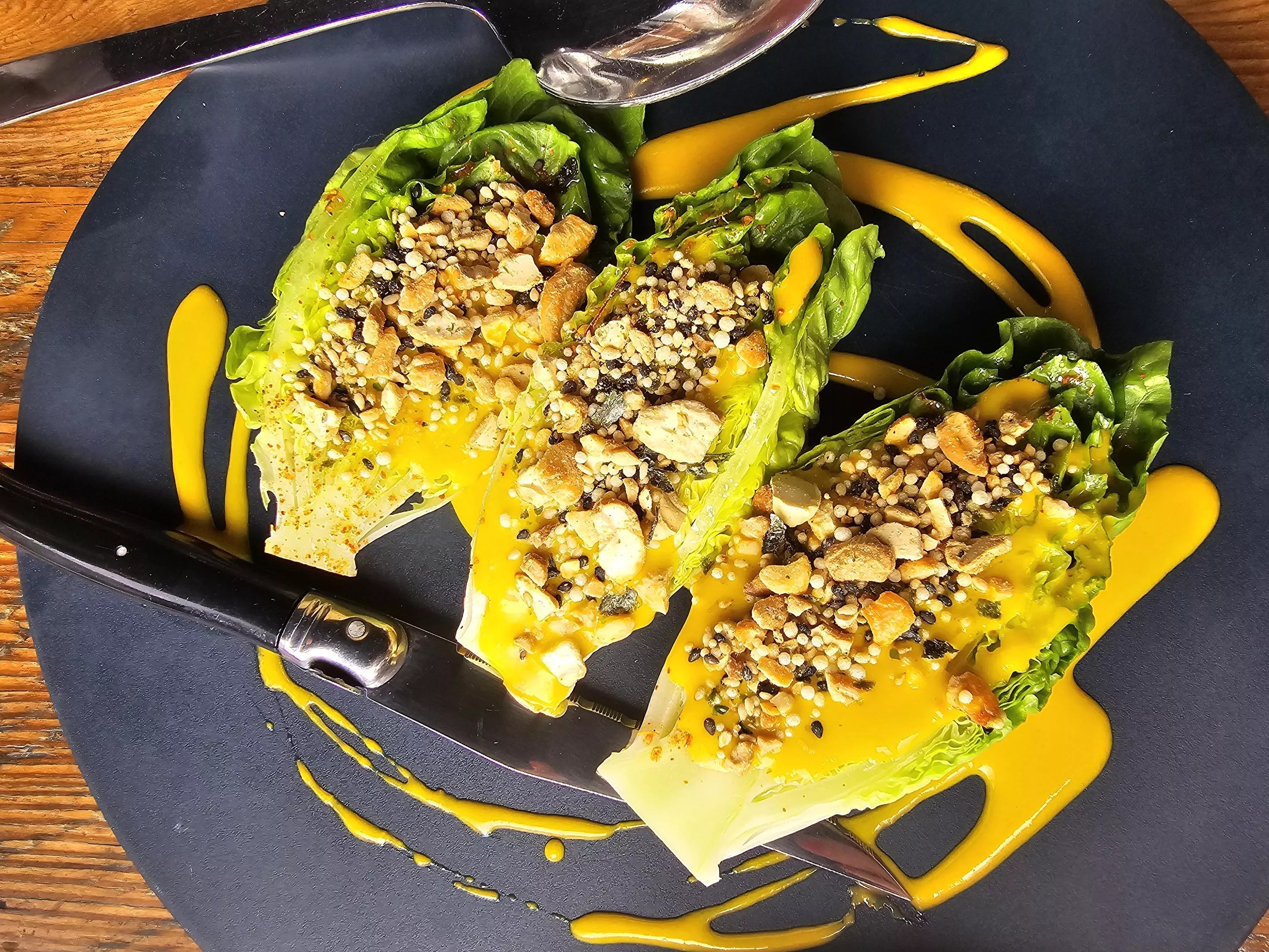 Highlights include tuna tartare inside crisp spring roll wrappers with yuzu-ponzu aioli; a Little Gem salad with bright carrot-ginger dressing and crunchy cashew crumbs that can be ordered chilled or grilled; and tom kha xiao long bao (soup dumplings) — a dish created by chef de cuisine Stewart Gray.