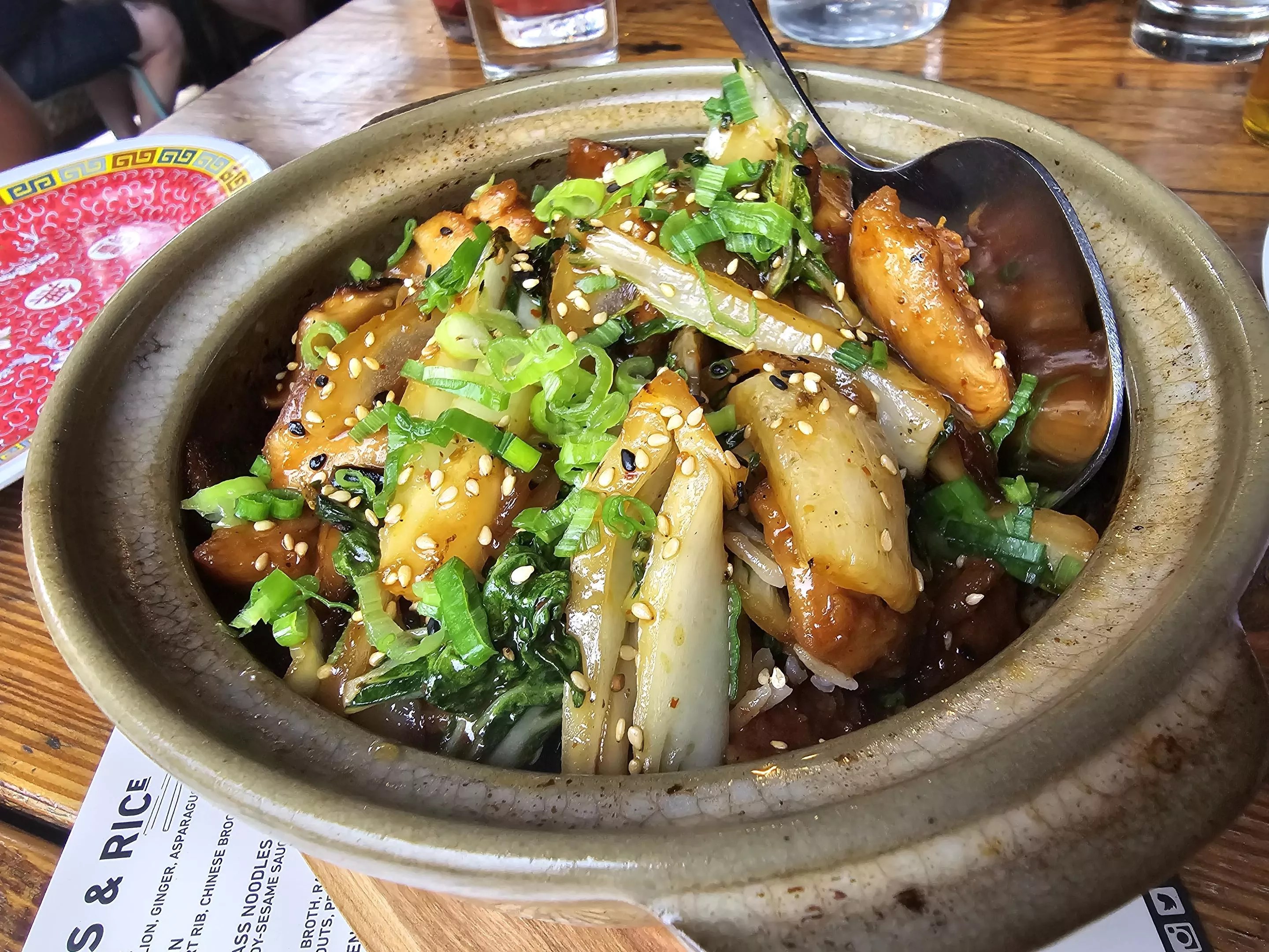 Among the standouts from the larger-format dishes are the Cantonese clay pot chicken, which is served sizzling and includes a layer of crispy rice at the bottom; and the Thai-style whole Colorado striped bass with chili coconut dressing and green mango salad.