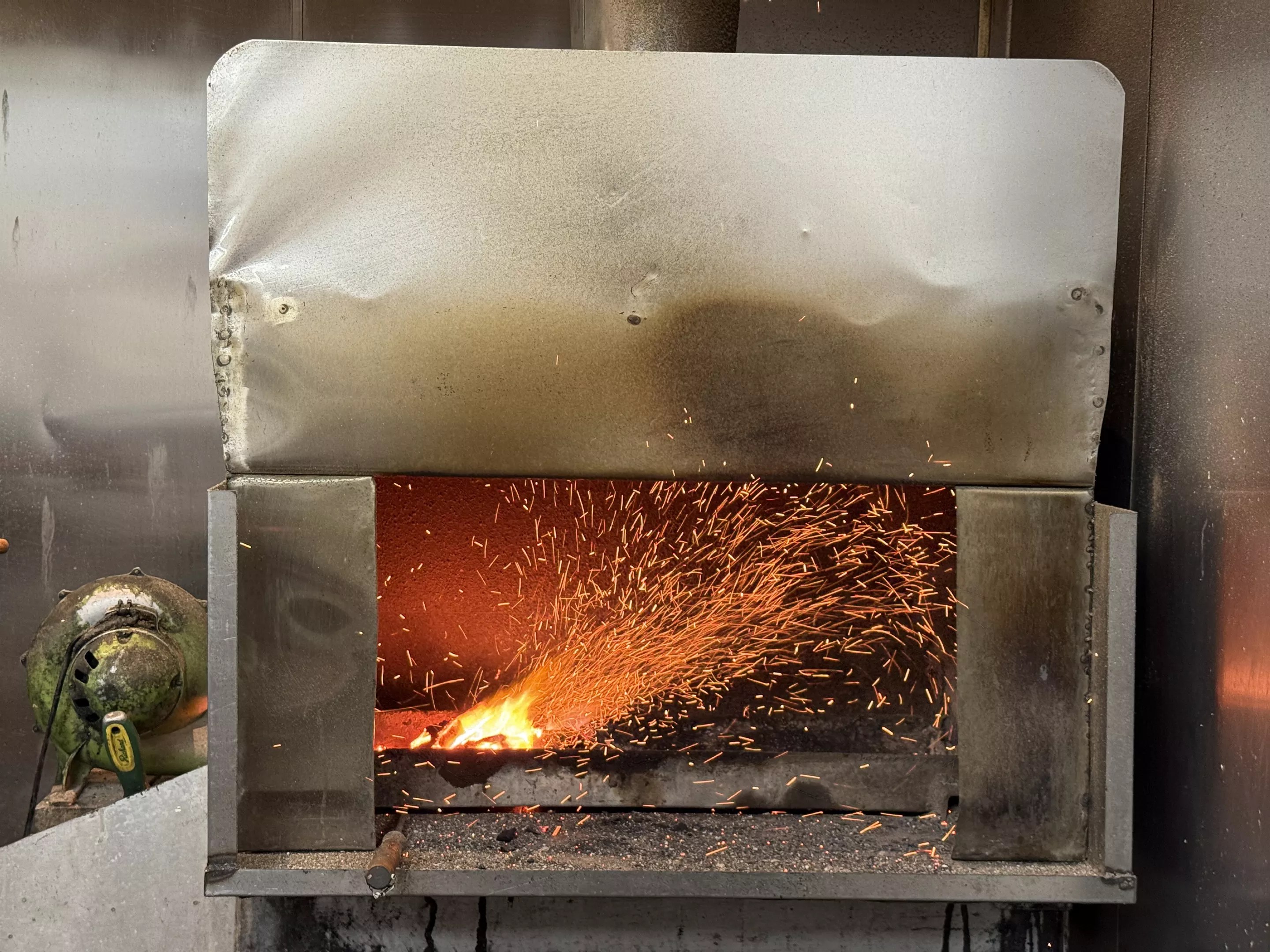 Standing outside the door, you can hear the fuel crackle and snap sharply, sending red and yellow embers into the air like a backyard fire pit barbecue. Inside, you’ll find a small group of men standing in front of the inferno, taking handfuls of ground meat from a large metal bowl and pressing them around long flat skewers to place directly into the flame.