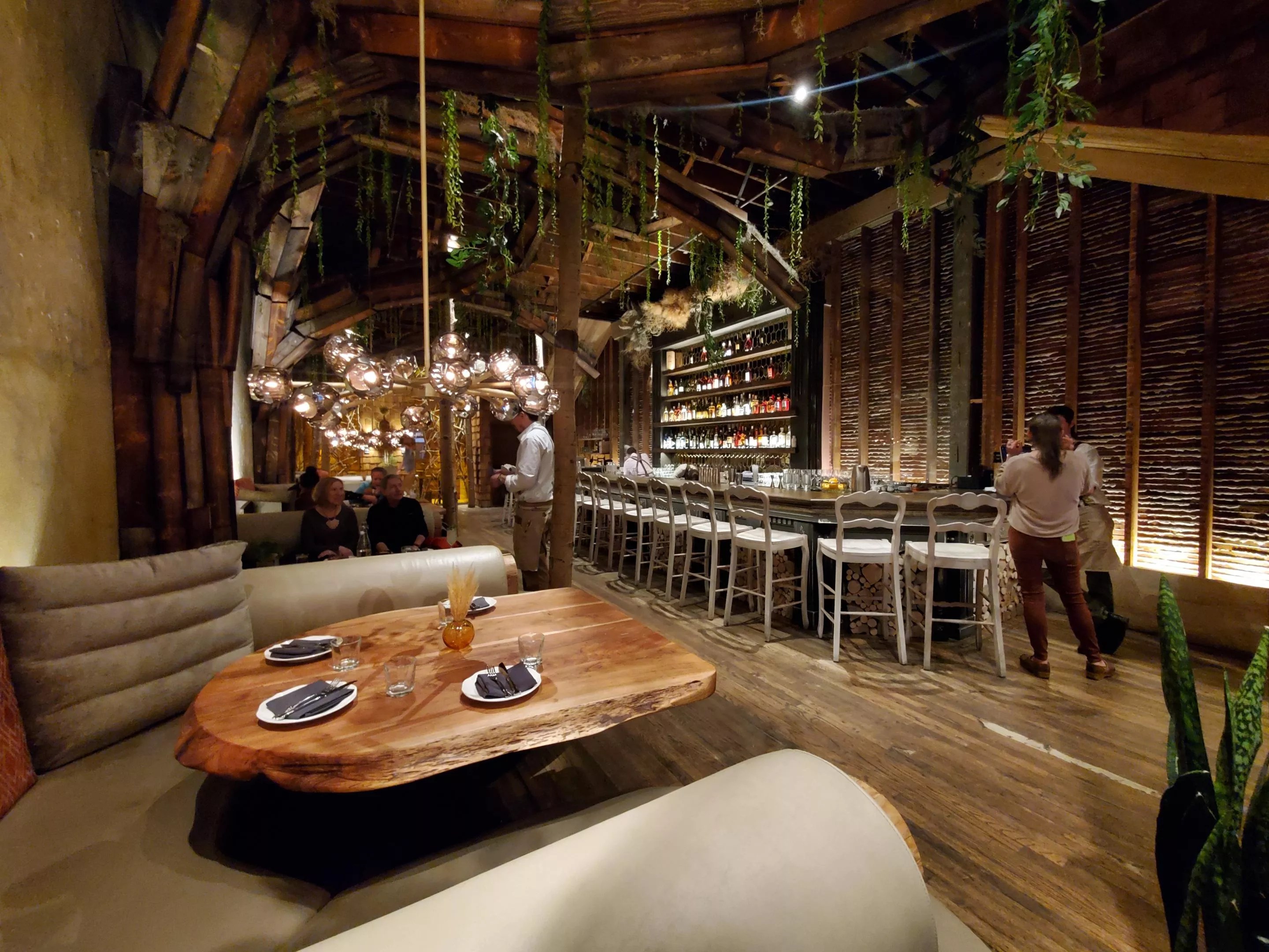 Aspen tree decals on the exterior window hint at what’s inside. The entryway is lined with greenery, and once you reach the host stand, it’s a full-on enchanted forest experience with an elegant edge. Those original aspen trees remain (as do the bathroom sinks), but there are also whimsical light fixtures, thick wooden tables, curvy booths and even more trees — the new ones are constructed out of slabs of wood.