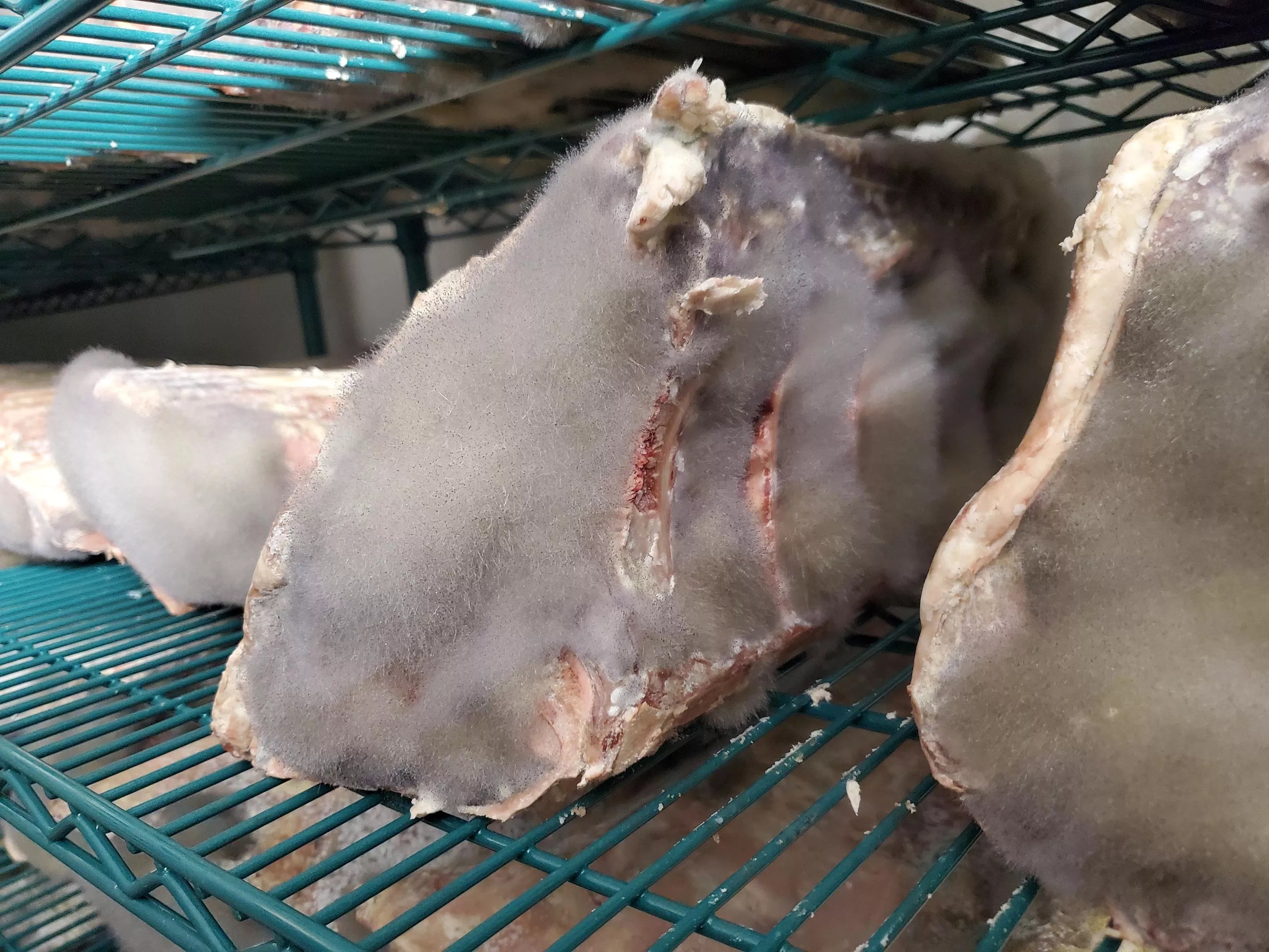 The shelves are lined with cuts of beef in varying stages of dry-aging. But unlike most dry-aged beef, this meat is covered with mold — some of it so thick and fuzzy that you can barely tell there’s beef underneath.