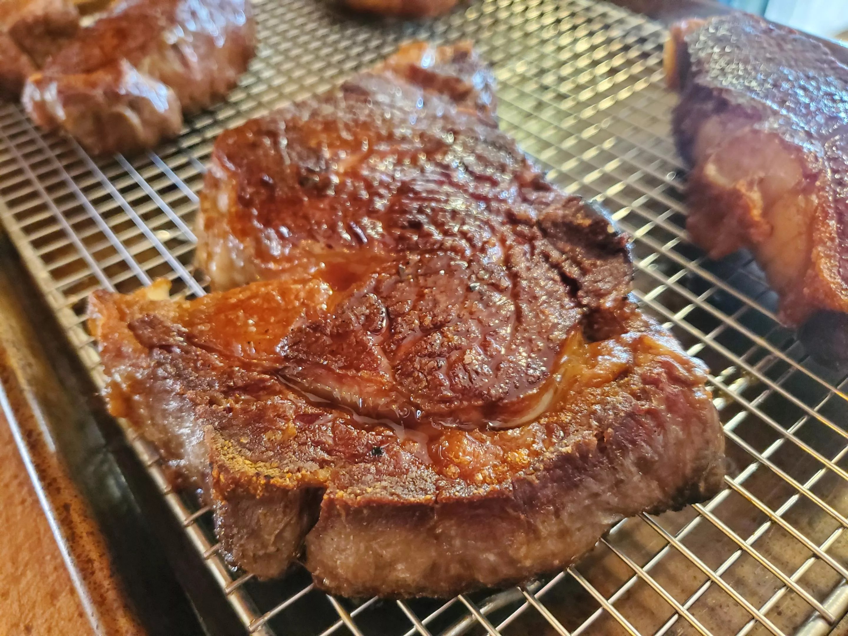 But Brunson has another kind of meat on his mind these days. Back at home, just a few minutes from Meat Cleaver, he heats several cast-iron pans on the stove and begins searing a variety of steaks. The aroma that fills the kitchen is unlike any other — popcorny, like the dry-aging room, with a buttery sweetness.