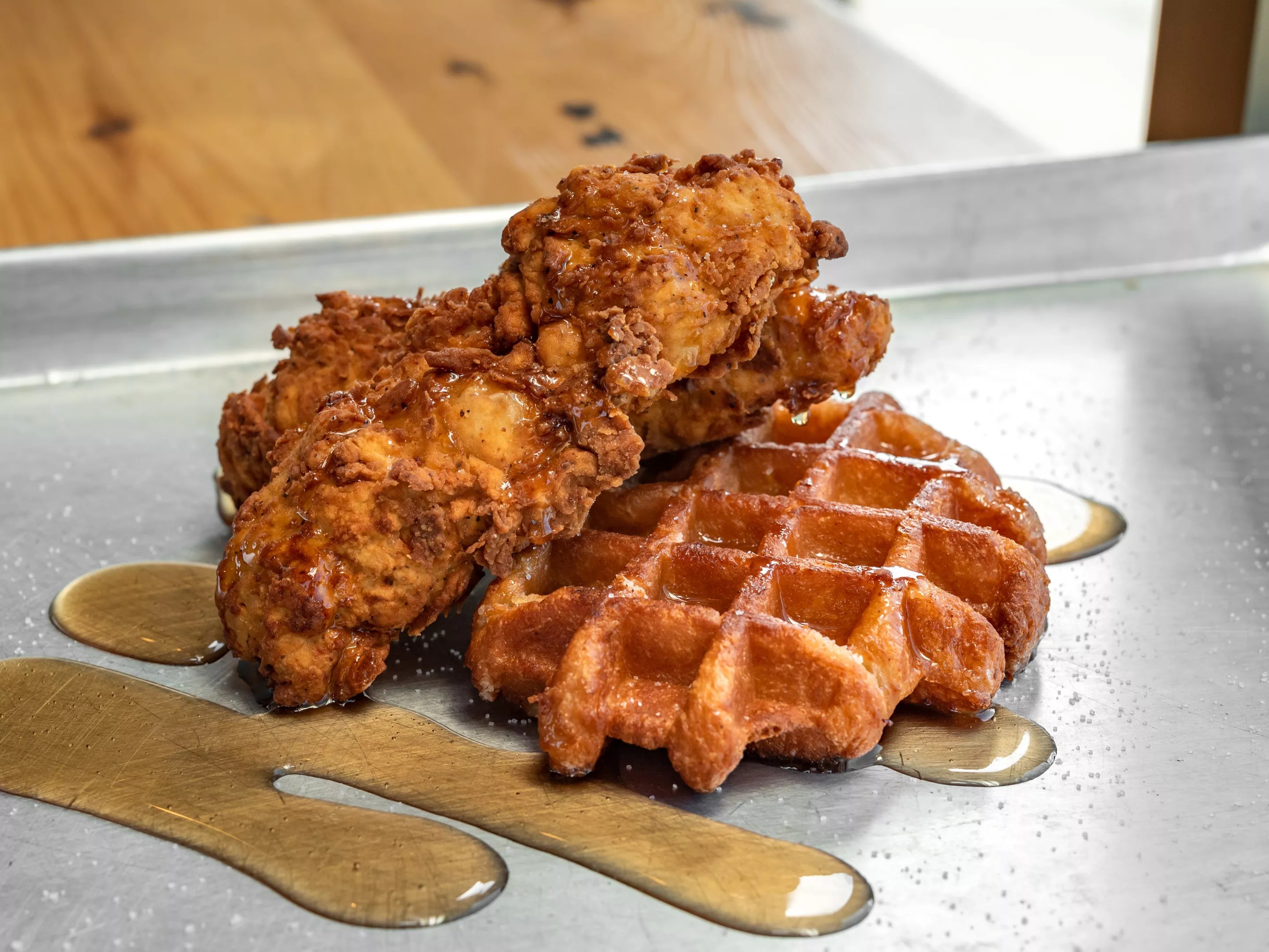 Chicken n’ Waffle drizzled in syrup and served all day.