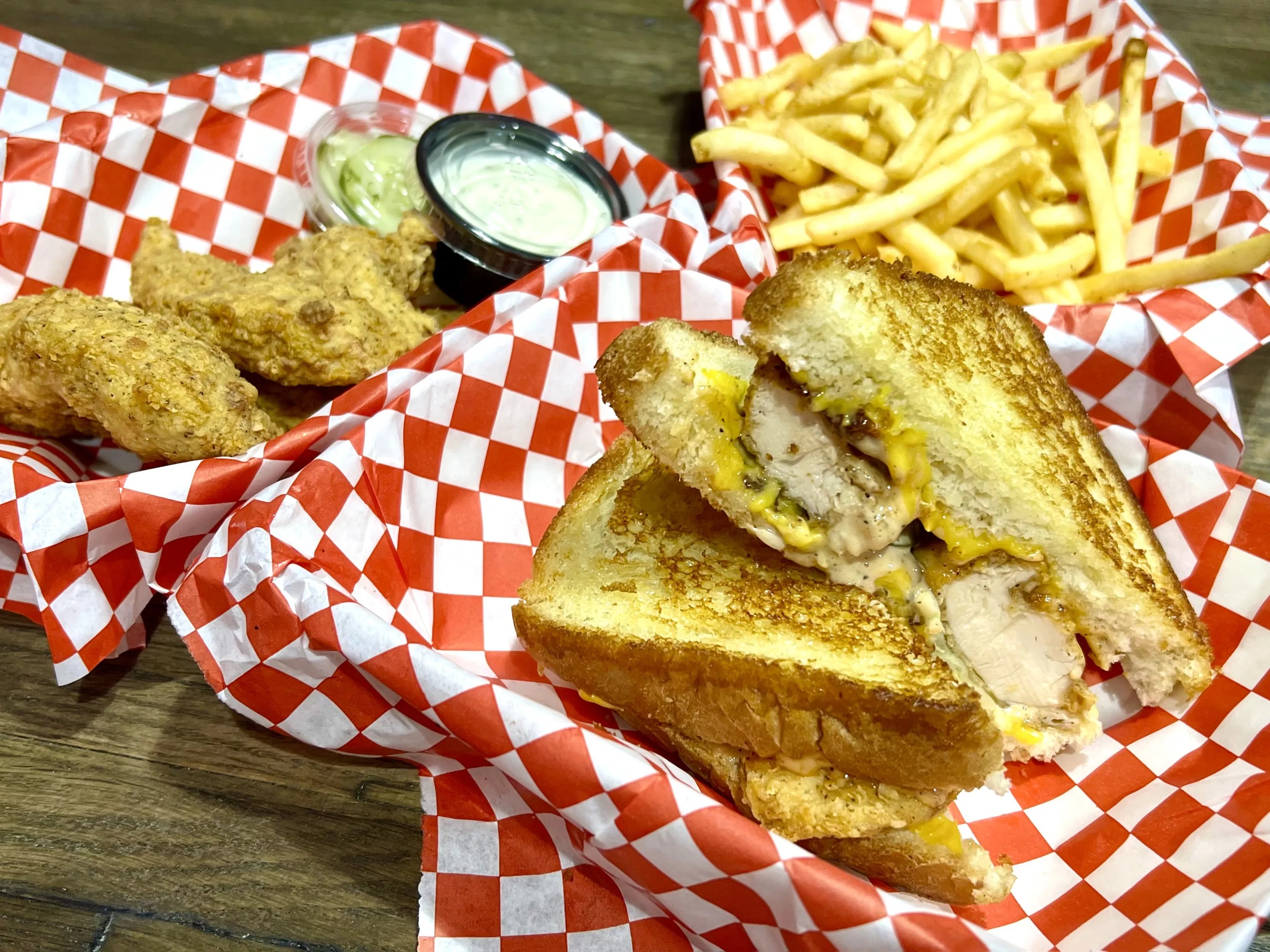 Cluck Chicken offers chicken tenders with a variety of sauce options as well as the chicken sandwich on Texas toast.