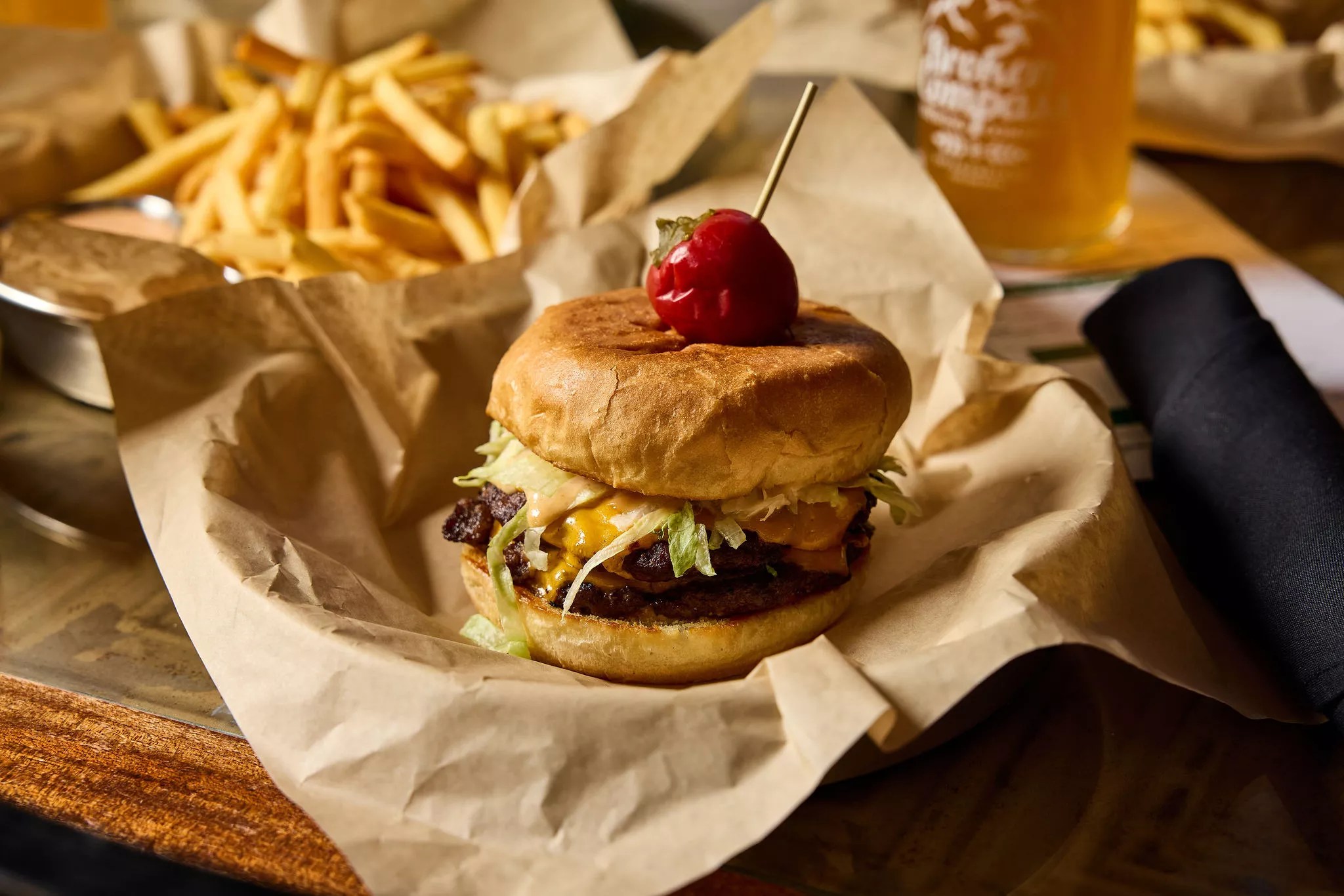 The burger features a double patty, American cheese, lettuce, pickle, onion and special sauce.