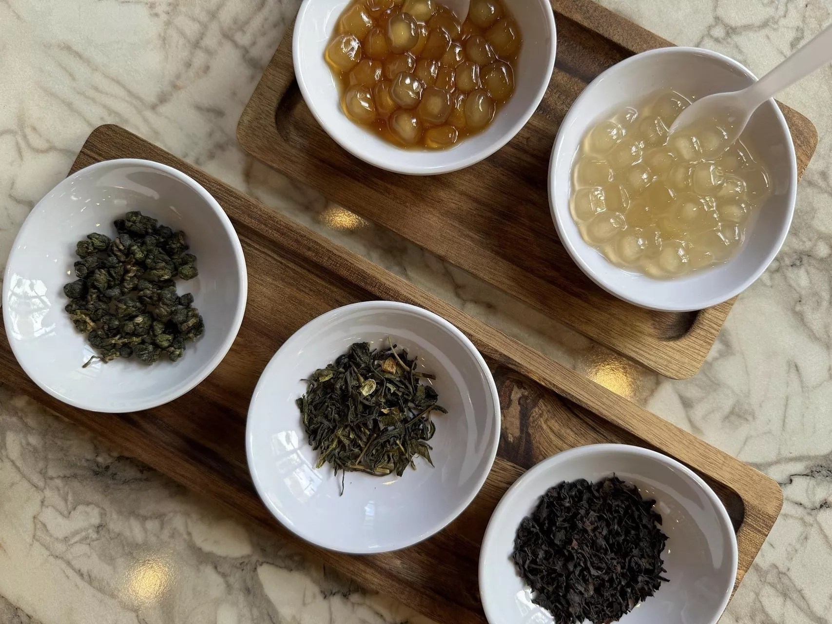 Two types of boba (brown sugar and honey) and three types of tea (oolong, green and black) used at Latea.