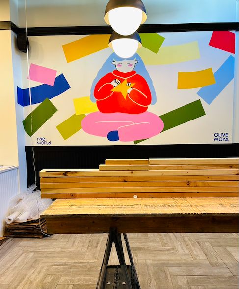 One of the signature ways that Huck brightened the spot was by commissioning artists Olive Moya and Rae World to collaborate on a mural inside the cafe. Moya has done murals for all five of Huck’s other locations, too.
