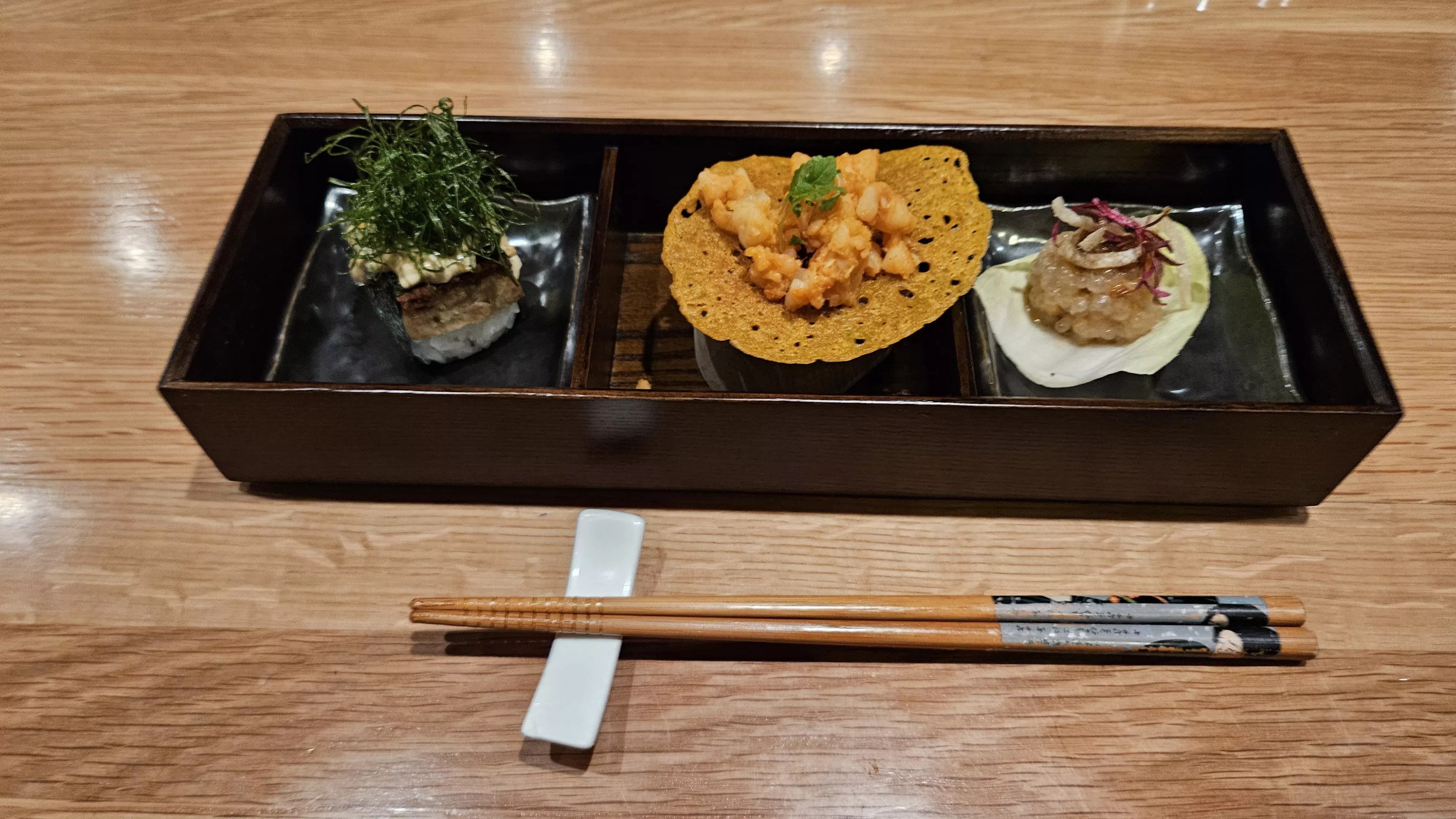 Ukiyo Bento Trio appetizer with Bahn Xeo Tuile and Shrimp, Lao Spam Musubi with Gel Bong Aioli, Sakoo and Purple Cabbage.