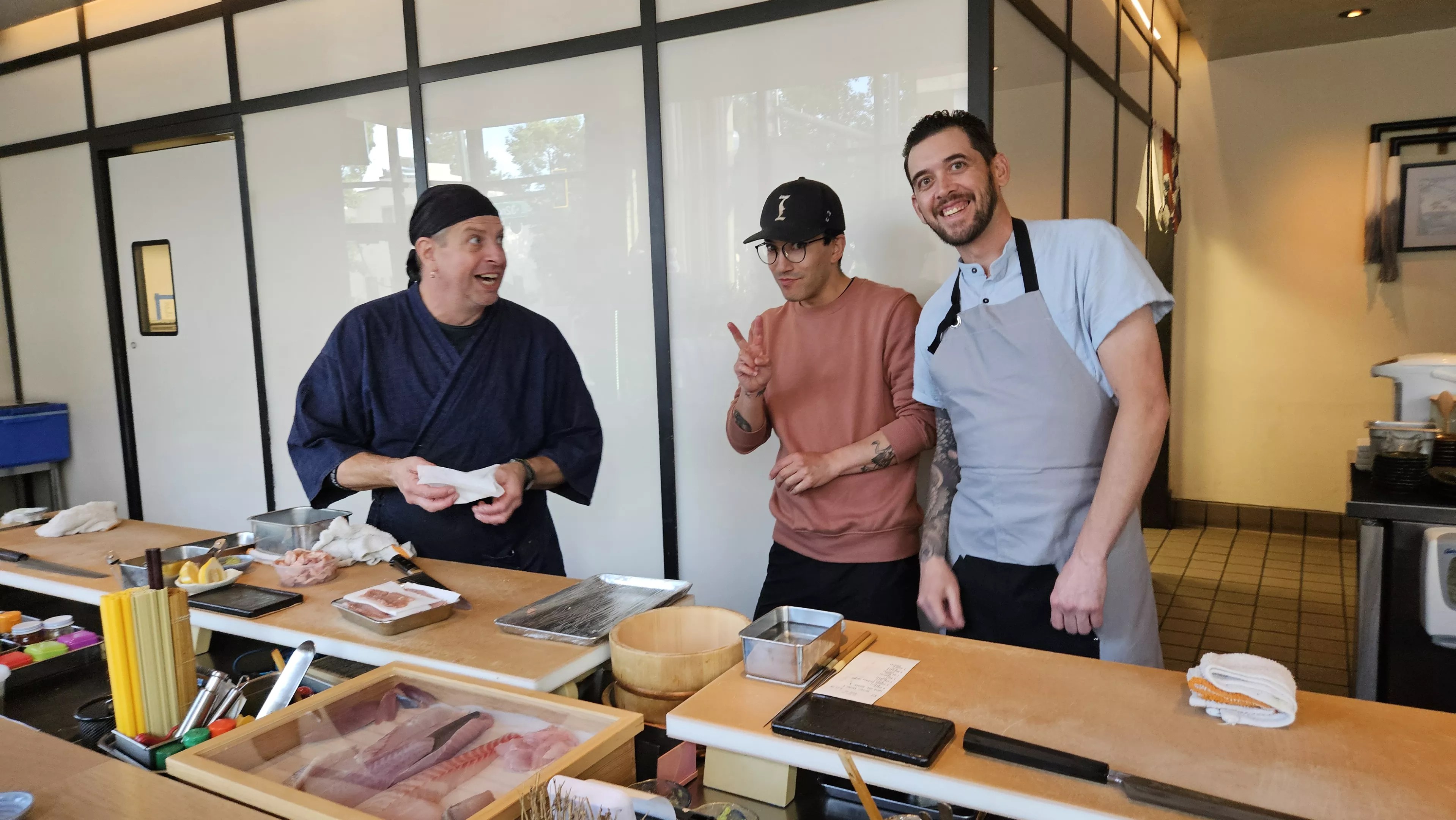 Chef Corey Baker (right) and his team create the sushi at Kumoya.