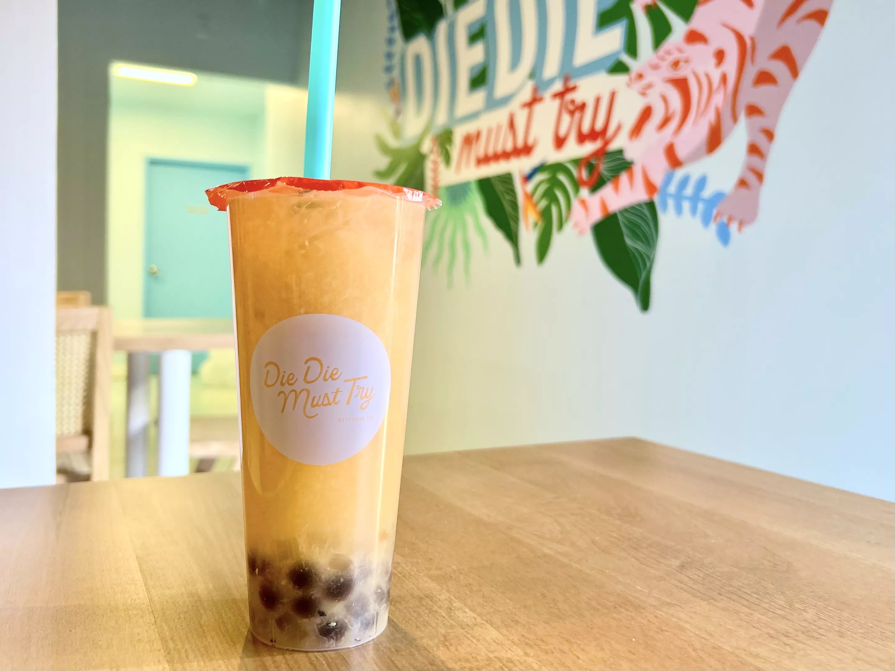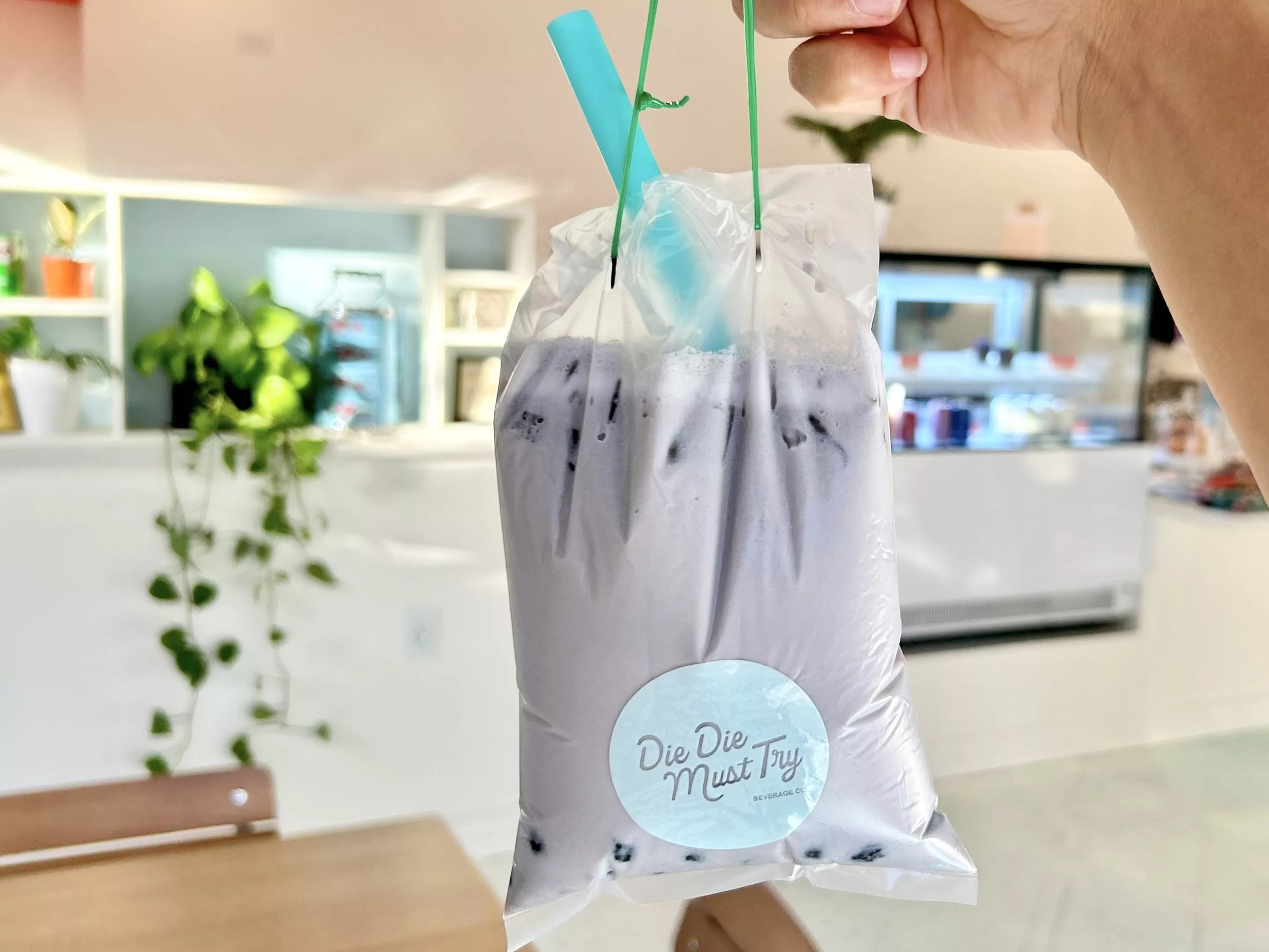 Die Die Must Try beverages come in sealed cups, as is standard at most bubble tea shops. But to further elevate the culture of Singapore, guests can request that their beverages be served in a da bao bag. Chow describes this as “the authentic Singapore style of enjoying your drink on the go.”