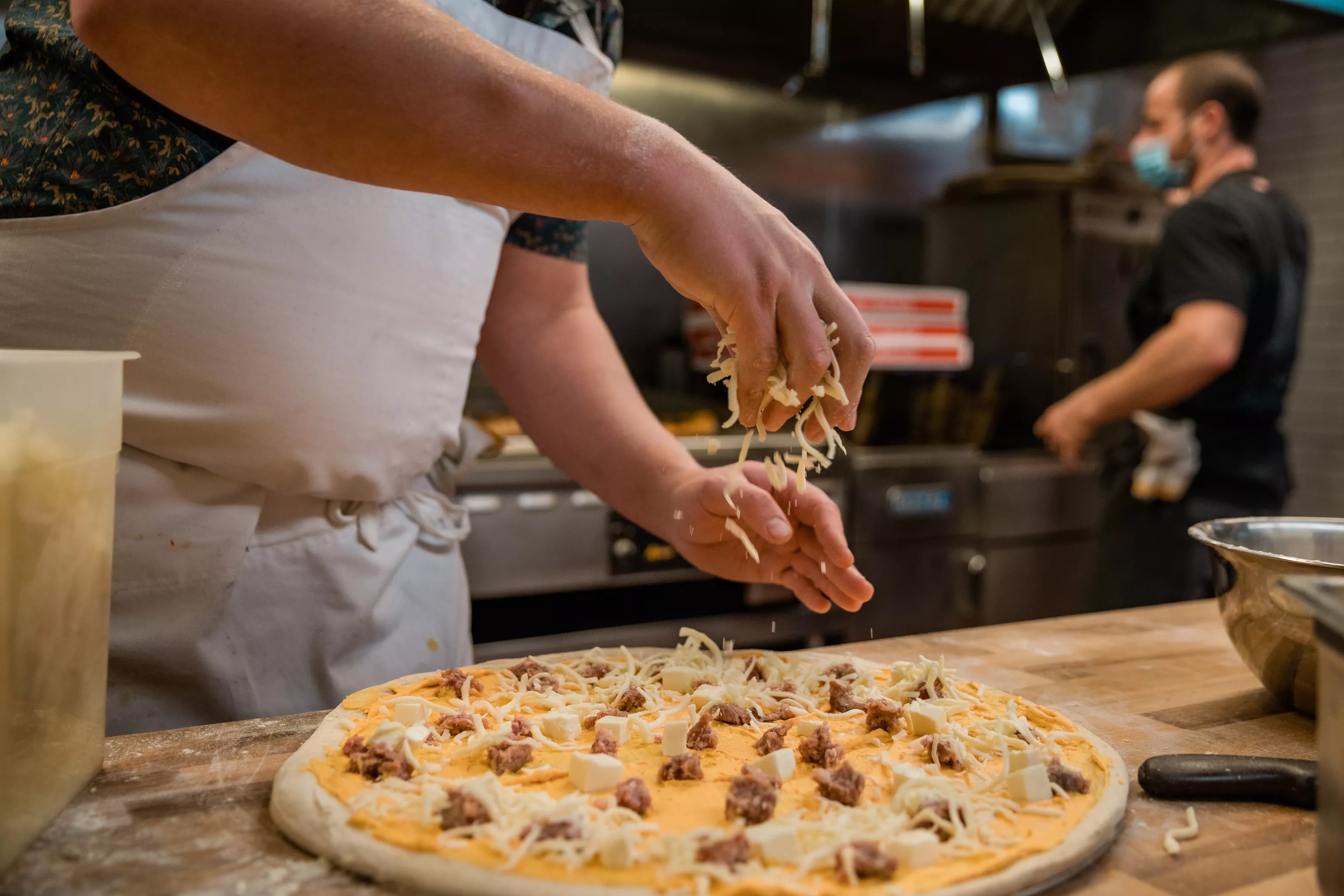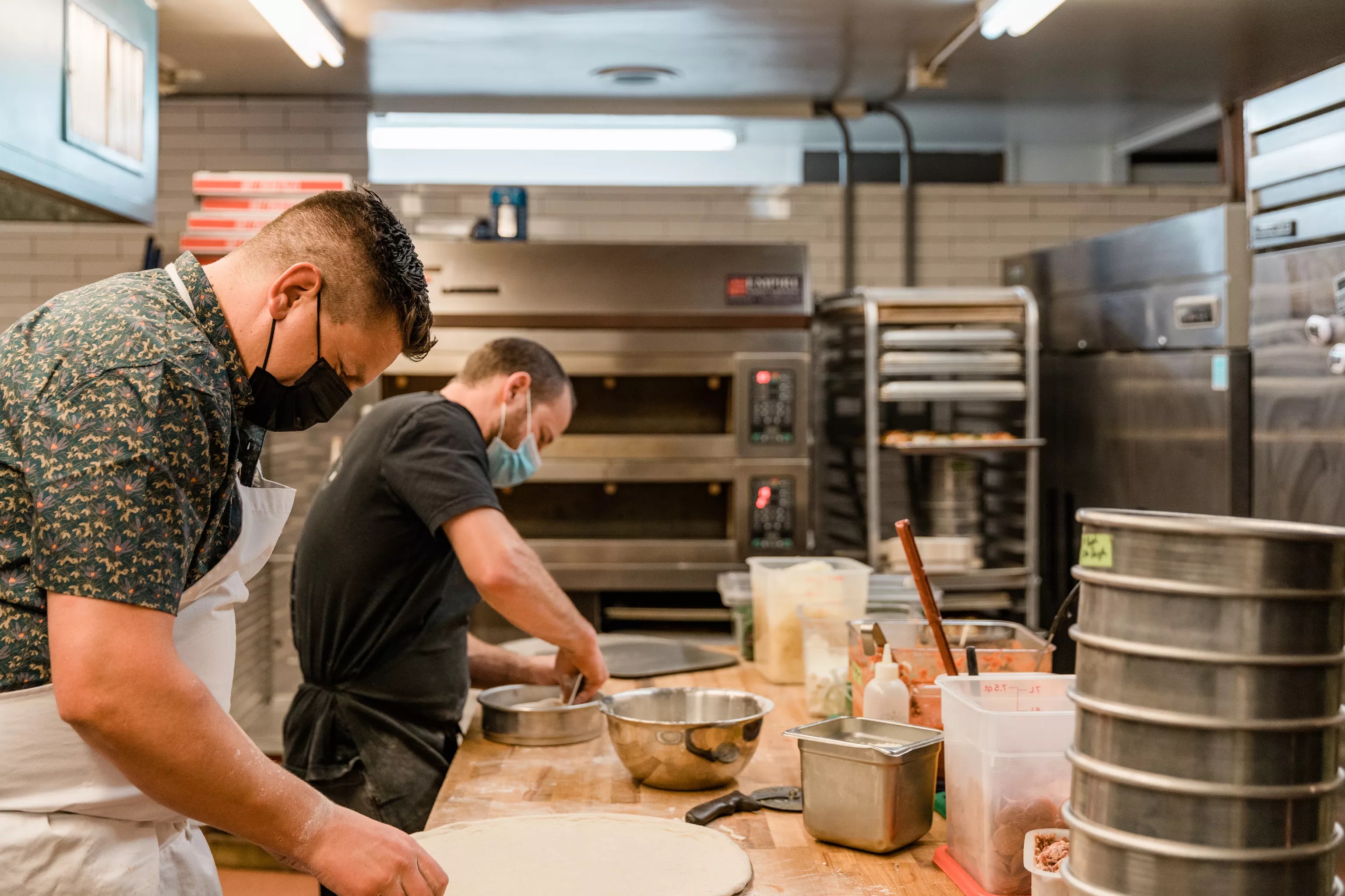 Spencer White (front) and Alex Figura prep Redeemer pizzas.
