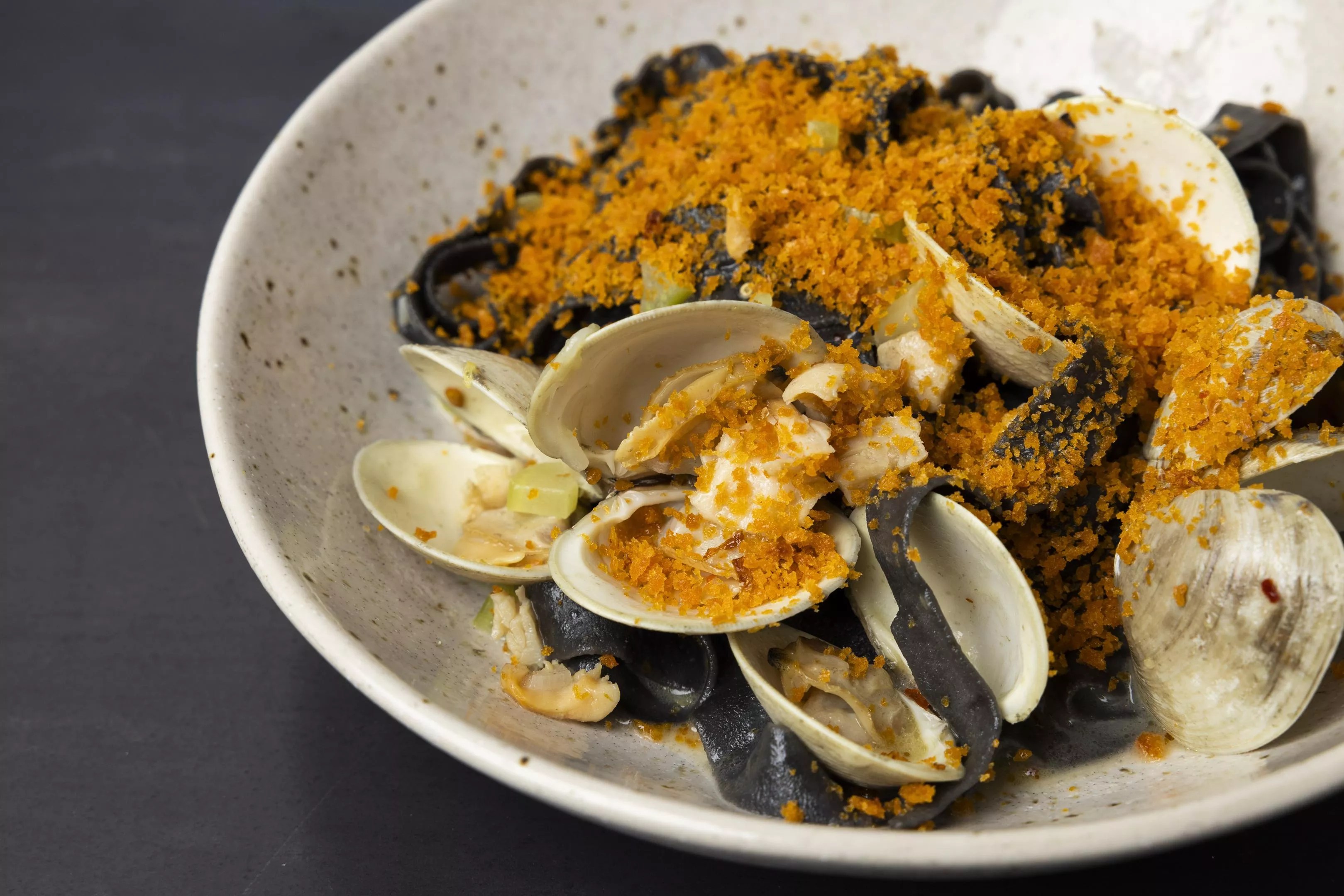 Squid ink fettuccine with clam ragu.
