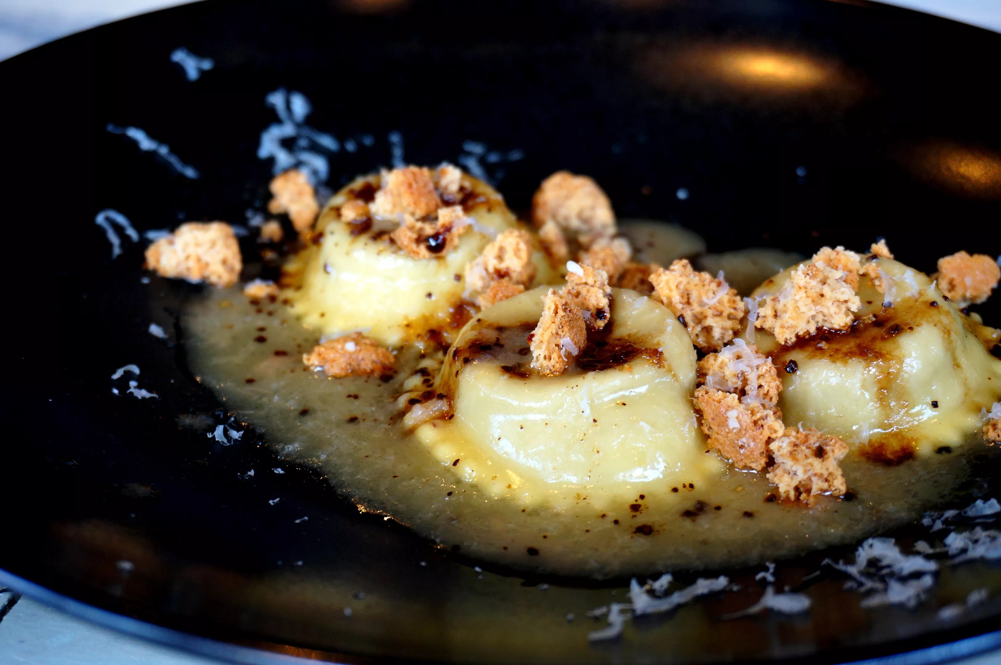 At the bar, Nancy Kwon – who just moved here from Los Angeles, where she was named Best Bartender in 2015 by our sister paper, the LA Weekly – has designed a cocktail roster with a graphic-novel theme, complete with a printed menu inspired by the art of Heavy Metal. Just as Emmerson itself nods to grains, the bar program focuses on grain-based spirits – but not to the exclusion of rum, mezcal or gin. Oxtail ravioli with amaretto cookie crumbles. Mark Antonation Top row: AGM Ben Foote, GM Tre Gerbitz, owner Ben Kaplan. Front row: chef Michael Gibney, bar manager Nancy Kwon and pastry chef Jeb Breakell. Mark Antonation