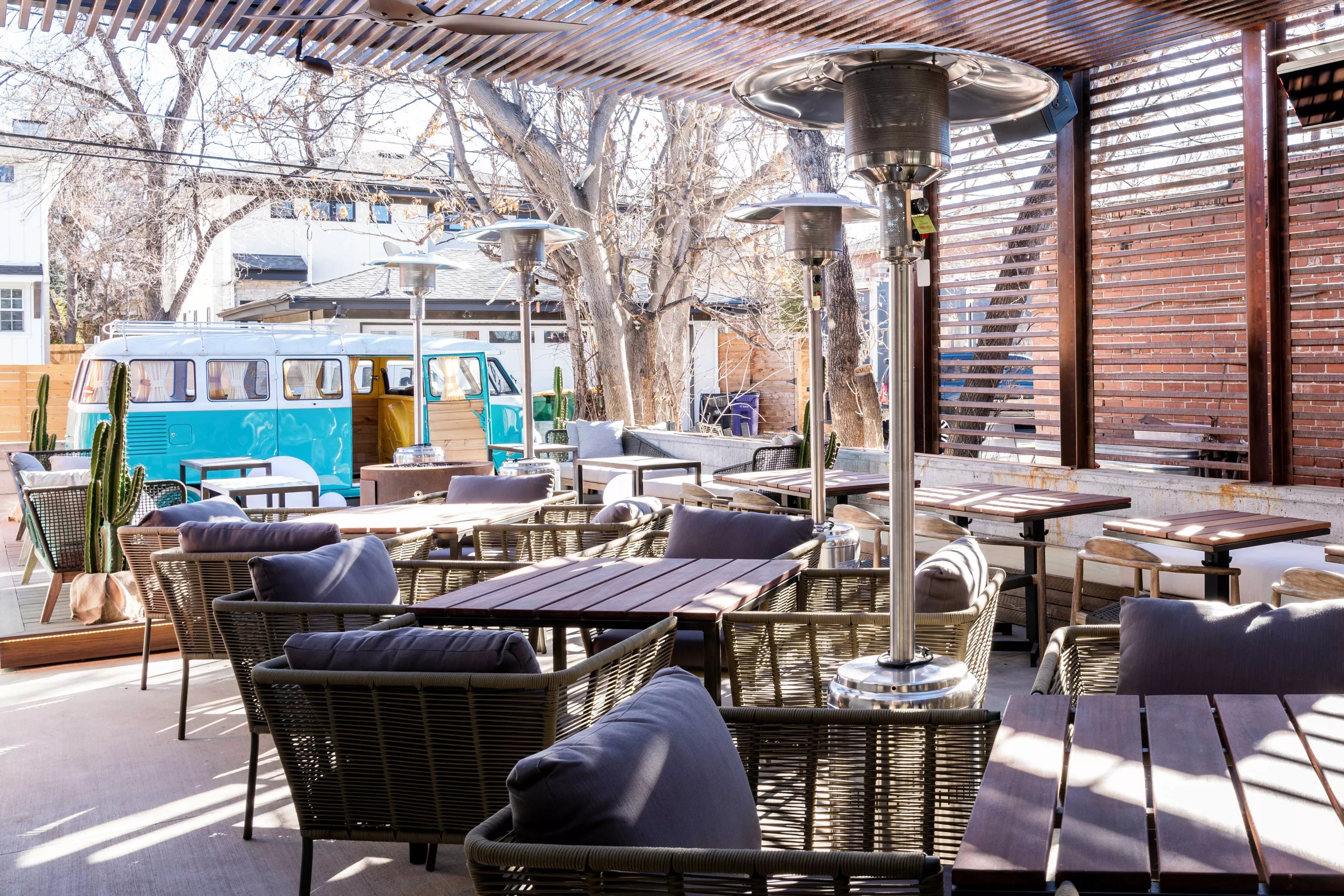 Perdida’s patio seating includes a renovated VW bus.