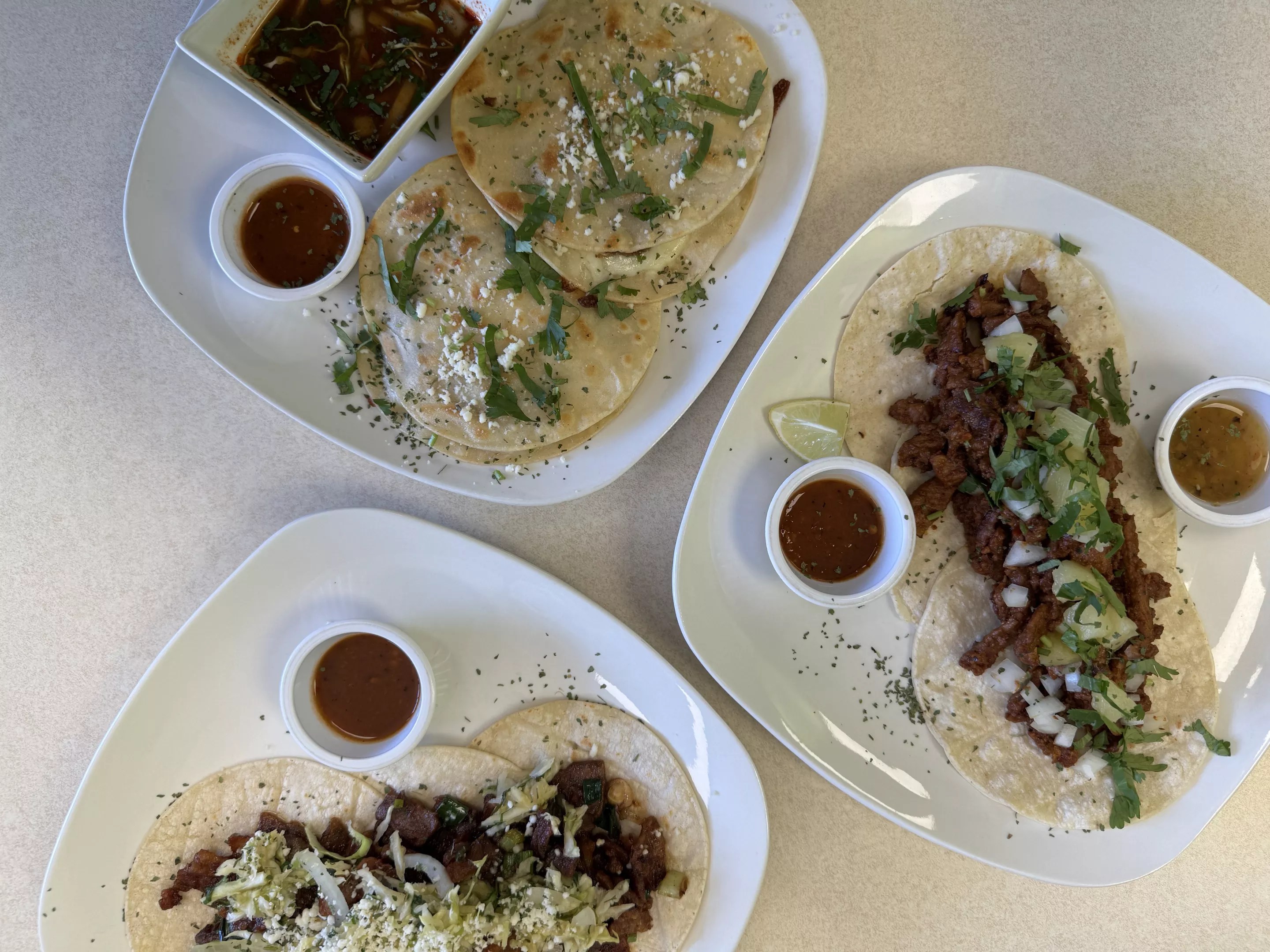 Quesadilla barbacoa, tacos al pastor and tacos chicharron from Xicamiti,