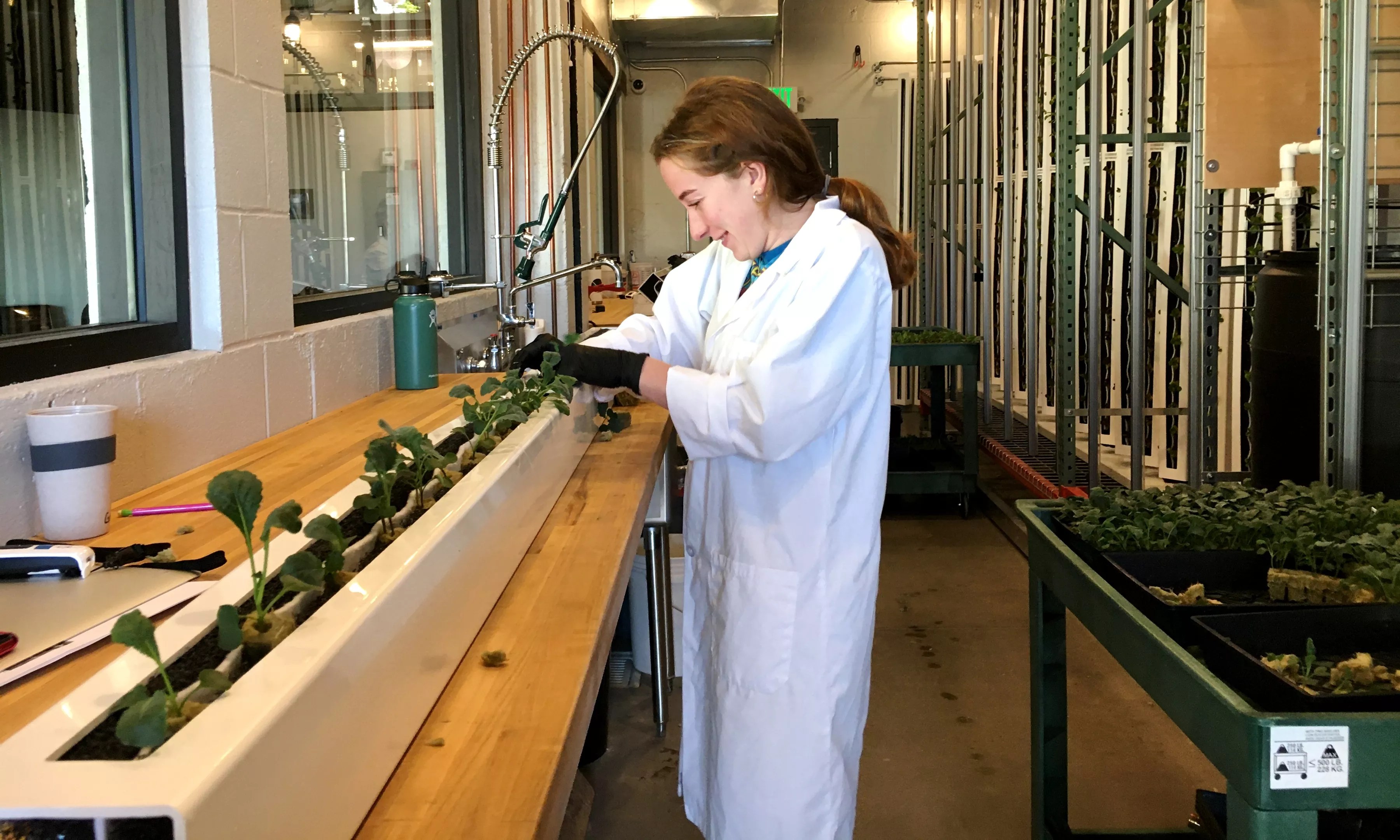 A Grow & Gather team member plants kale sprouts in a hydroponic grower that will hang vertically.