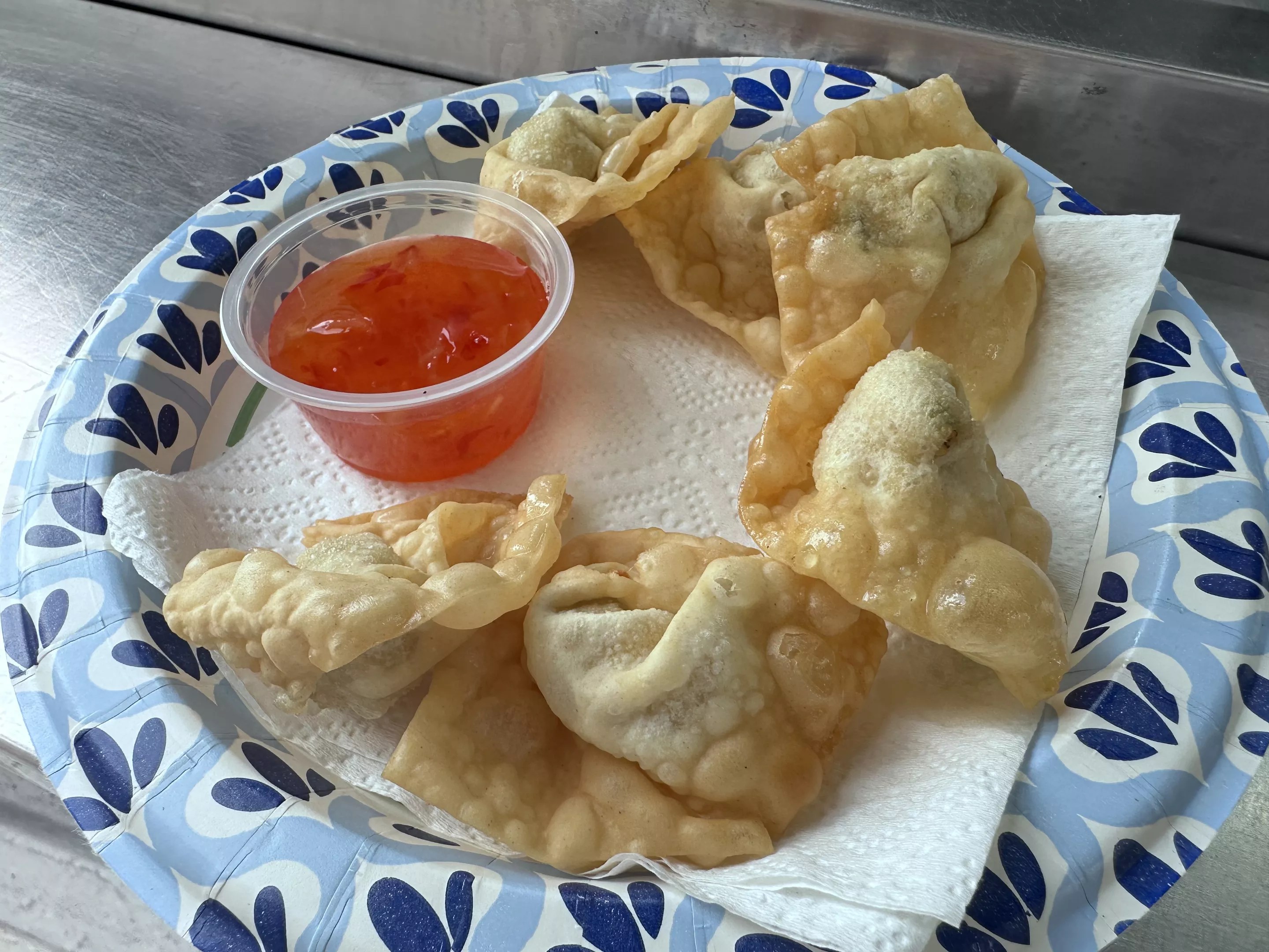 A fan favorite at Krazy Thai, these crispy Crab Cheese Wontons are handmade by Jesse Porter, who takes pride in crafting each bite from scratch.