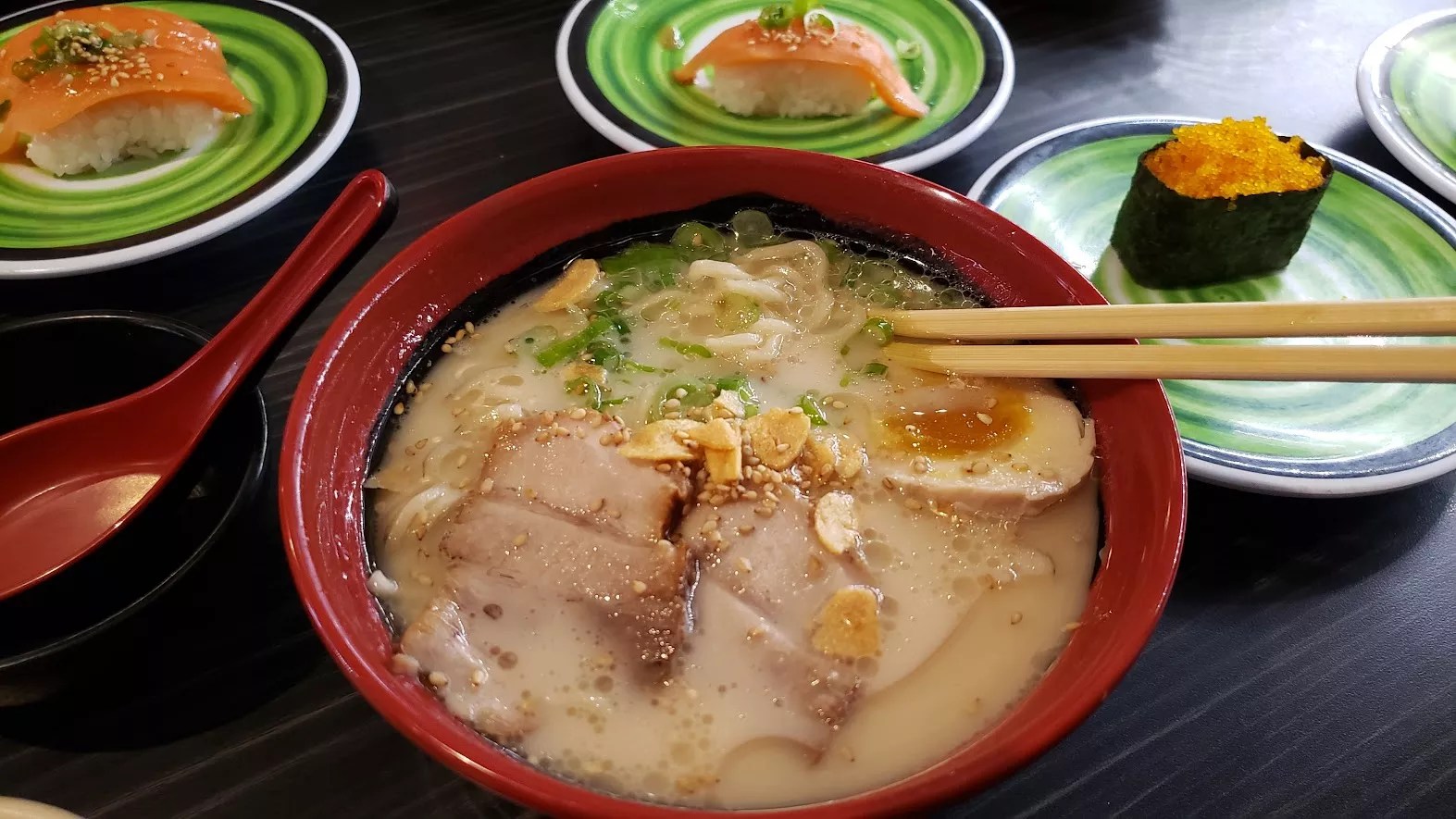 Kura Sushi doesn’t just send fish down the conveyor belt — diners can order a variety of Japanese dishes, including some surprisingly good ramen, served here at the Los Angeles Little Tokyo location.