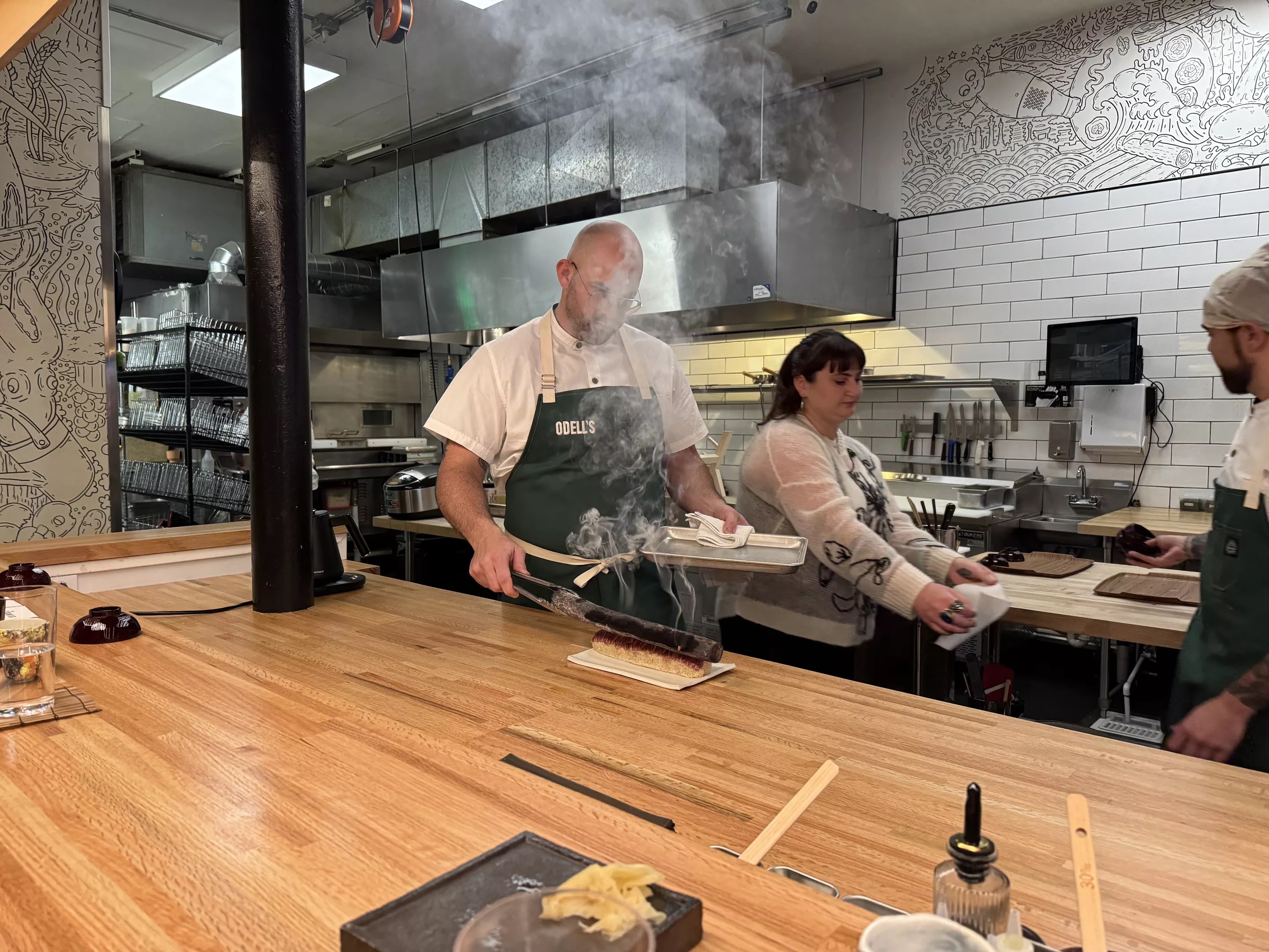 Because there are only two seatings every night — at 5:30 and 8 p.m.—the group progresses through the tasting menu together, leading to nice shared moments with strangers. When it was time for the last nigiri, an indulgent wagyu beef with foie gras and caviar, Odell took out a burning branch to sear the top of the wagyu. Everyone whipped out their phones and collectively oohed and aahed.