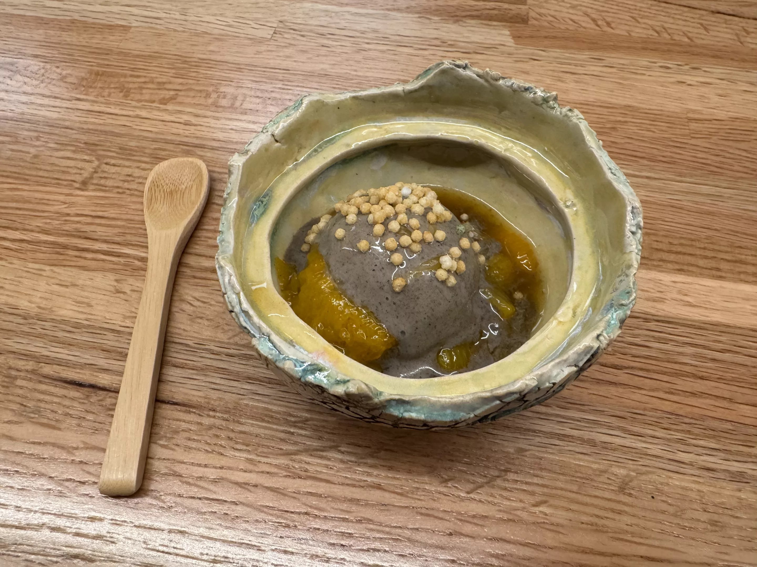 Dessert “dragon’s egg bowl” with mochi cake, topped with black sesame ice cream and flambeed orange.