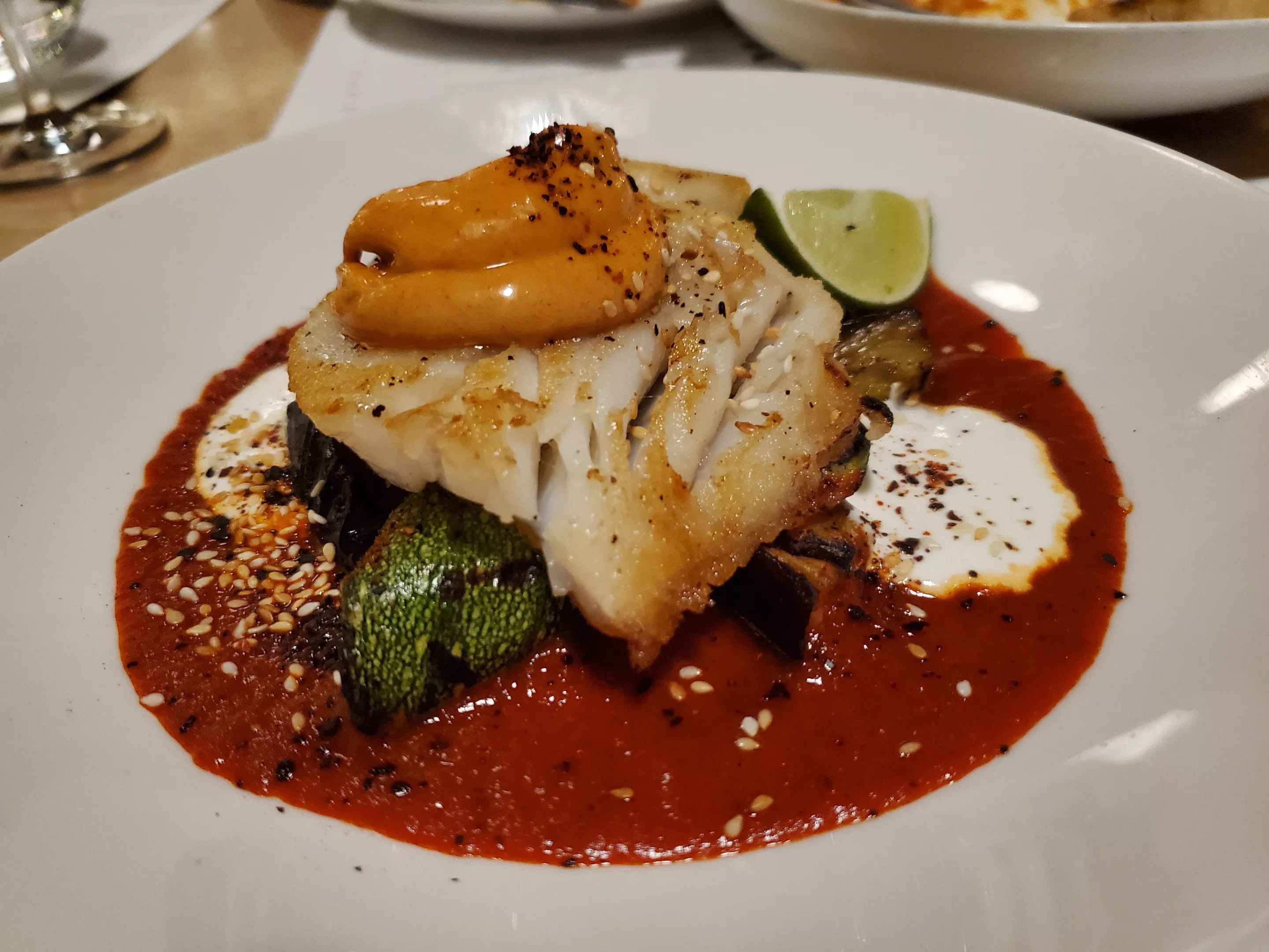 Tomatoes are prevalent throughout as well — not just in raw form, but in various sauces, like the plum tomatoes in the lobster broth for the busiate; preserved tomatoes in the eggplant puttanesca pappardelle; and the deep, smoky, tomato-based sauce for the cod, which also has guajillo chiles.
