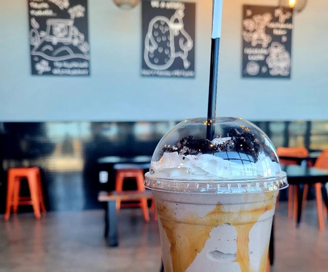 A thick shake and Keith Haring prints in the background at the new Westminster location of Chicken Rebel.