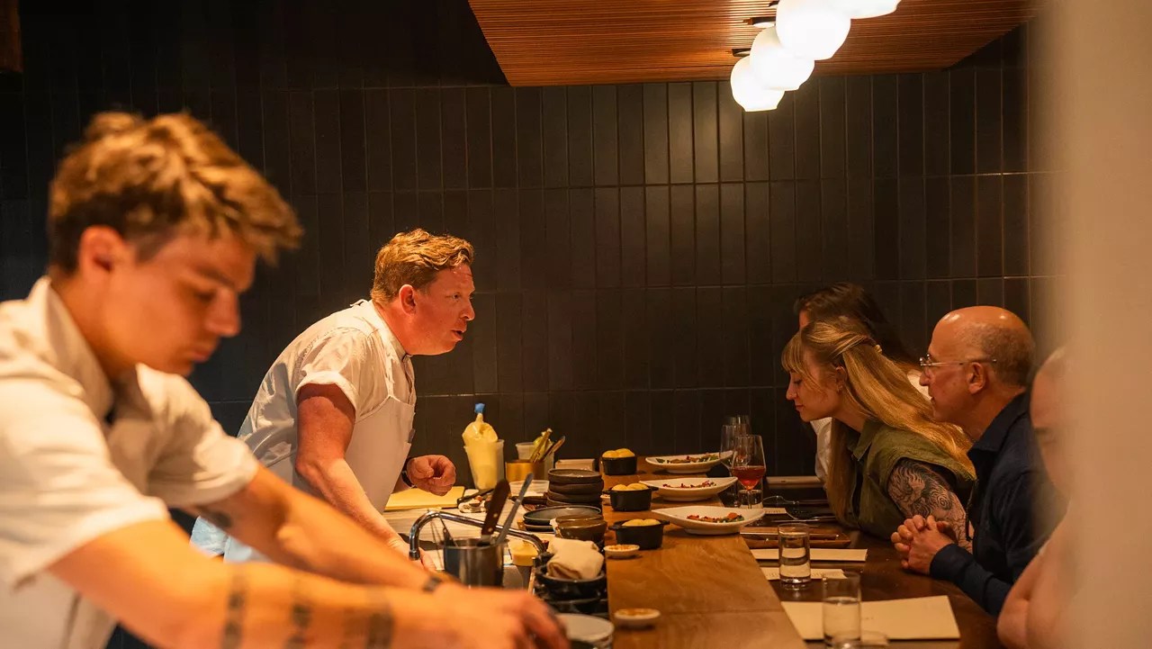 Justin Fulton interacting with guests seated at the chef’s counter.