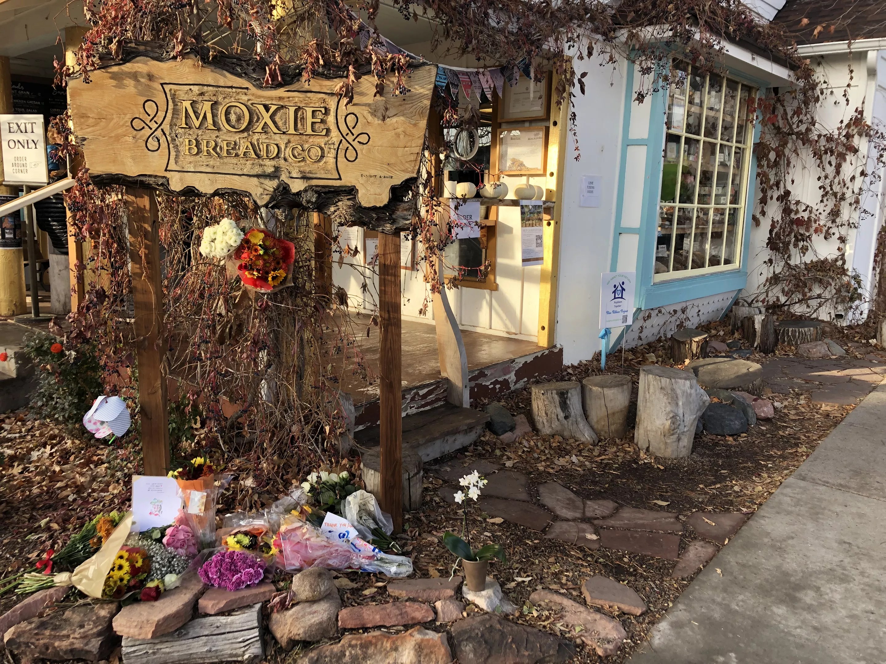 Mourners brought flowers and cards to Moxie’s Louisville location.