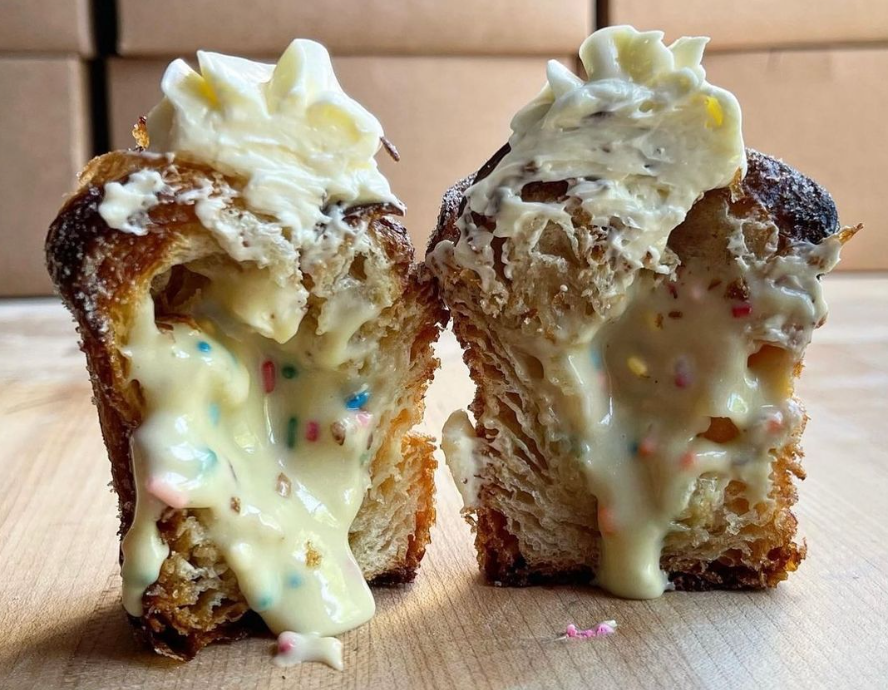 La Fillette, which moved into a new, bigger space in the Montclair neighborhood last year, has forgone the cruffin nickname for the more elegant croissant muffin. It’s even adapted the shape to a more ambitious croissant cylinder with a perfectly flat top, and it rotates through inventive flavors. In March, it served a mango and Chamoy version filled with mango crèmeux and topped with a lime whipped ganache, chamoy pate de fruit, lime fluid gel and TajÃn. This month, the seasonal recipe is a banana cream pie croissant muffin.