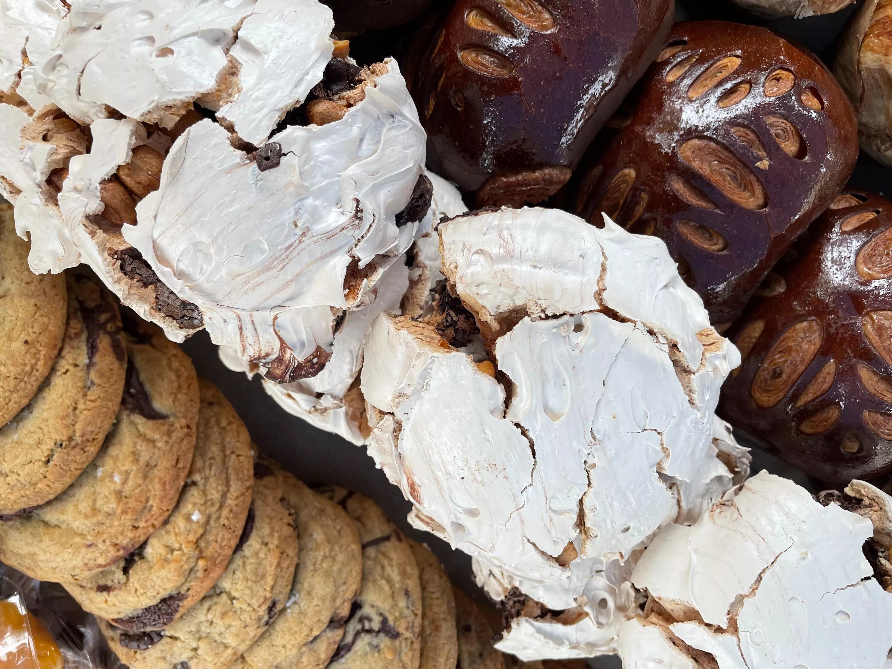 Another longstanding Moon Racoon staple is the Space Snickers, a simple meringue cookie filled with chocolate and peanuts that is baked to create a crunchy outside and gooey center. “They came about because we had too many leftover egg whites from making other fillings and needed a way to use them,” Lange explains. “Someone from our kitchen said they seemed like astronaut food the first time we made them, and this inspired the name. They are now one of our most popular items and happen to be gluten-free.”