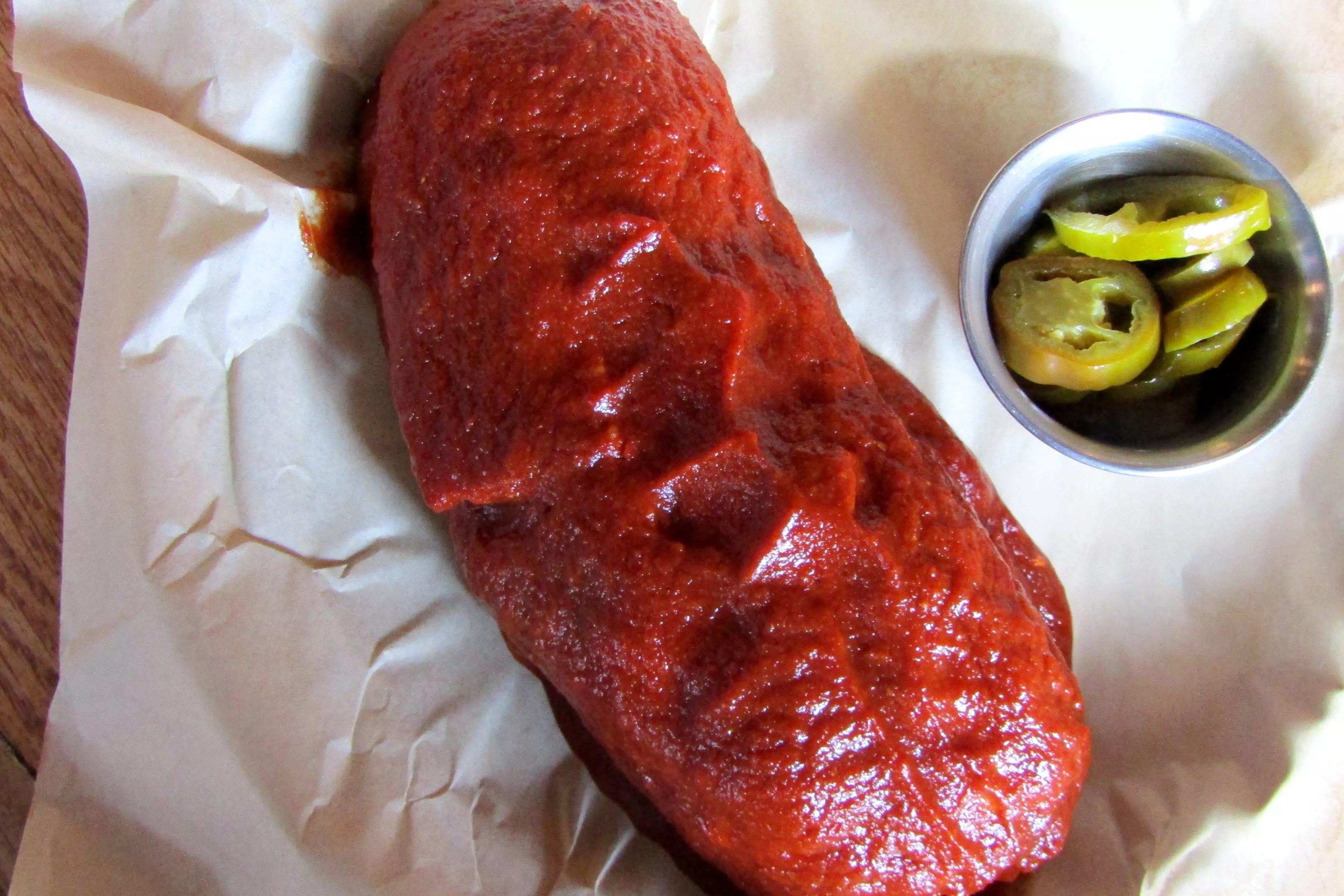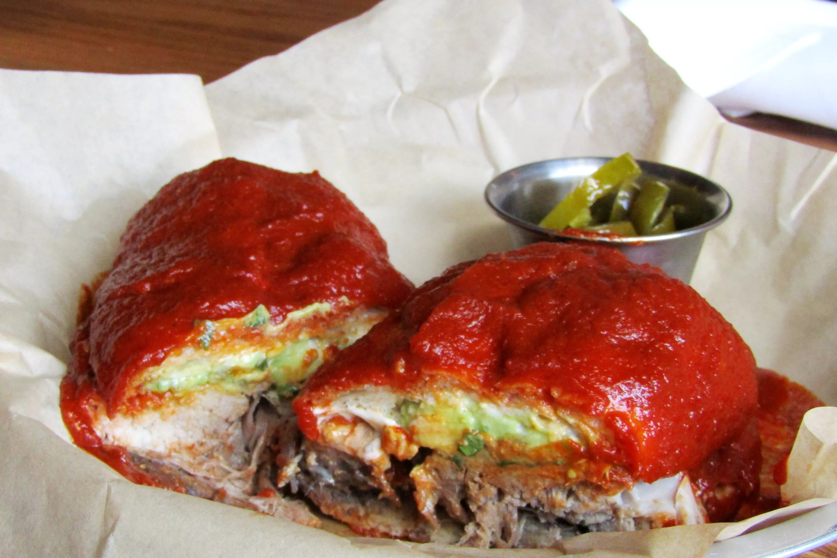 Feeley’s father was also in the restaurant business, and the chef has borrowed a couple of tricks from his dad’s playbook. Huntington Beach-style “strips and cheese” are a form of nachos in which corn tortilla strips are pulled hot from the fryer and immediately pelted with grated sharp cheddar. Feeley’s version is also topped with house salsa and guacamole. He notes that his dad also used to serve tableside Caesar salads, complete with chilled plates and forks. While Pony Up’s Caesar is constructed in the kitchen, it does include anchovies in the dressing, “eight-minute croutons” and confit garlic. Feeley says the crouton is a critical element in a good salad: “We call ours ‘crun-chewy’ because they’re cooked just long enough to be crunchy on the outside while staying soft in the middle,” he explains. There’s a sanwich under all that guajillo chile sauce. Mark Antonation The Torta Ahogada exposed. Mark Antonation