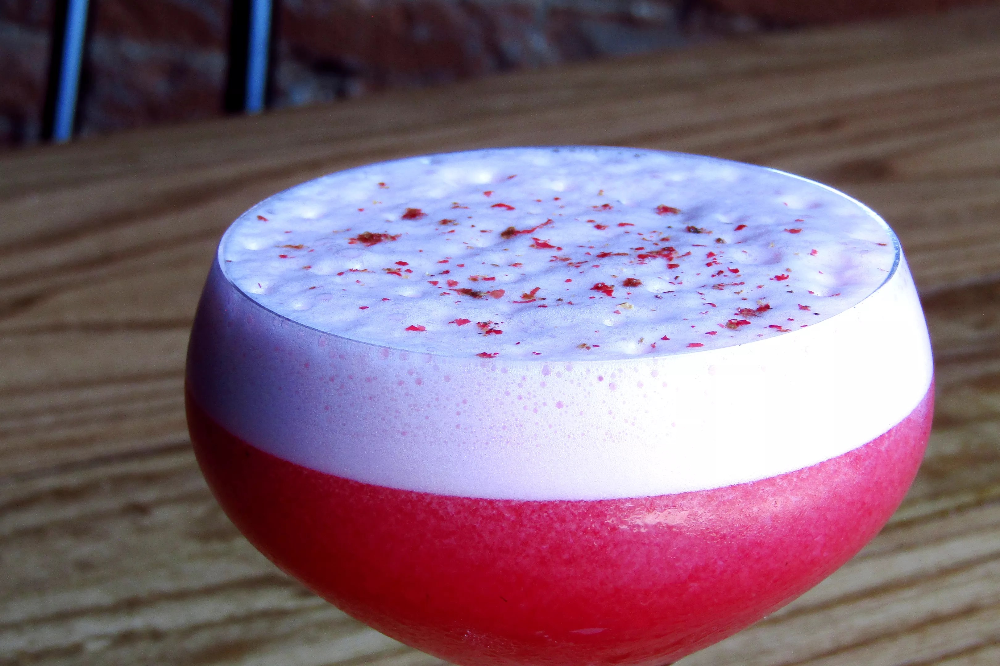 The Crimson & Clover Club looks a little fruity, but it’s actually tart and refreshing, with a hint of spice from pink peppercorns.