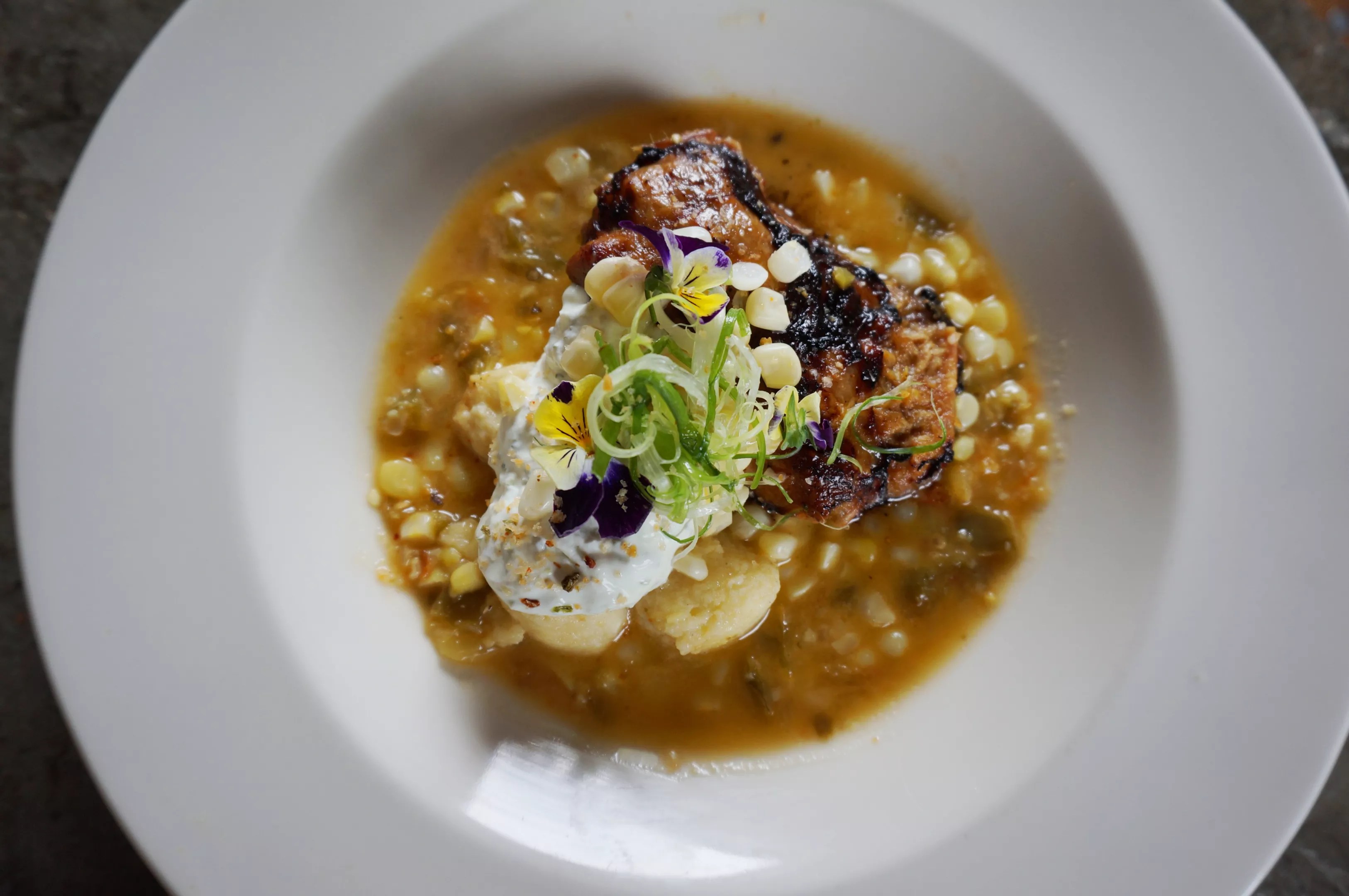 And we do remember: a whole octopus, its tentacles tightened into curlicues from the heat of the grill, almost writhing in a wash of chimichurri; tripe poutine with crisped batons of honeycomb beef stomach standing in for French fries, coming together by willpower alone with foie gras gravy and runnels of molten cheese curd; some pierogi stained red with beet juice, and others plumped with shredded pork and nestled into thick green chile; fermented tomato jelly forming a lagoon beneath burrata and a slab of fried green tomato; the signature housemade biscuit stuffed with the part of the pig you whisper all your deepest secrets to; a whole cured sardine sliced into cross-sections – was Damien Hirst in the kitchen? – and served with celery-root remoulade and saltine crackers, as if the whole plate were nothing more than a pantry snack rummaged late at night.