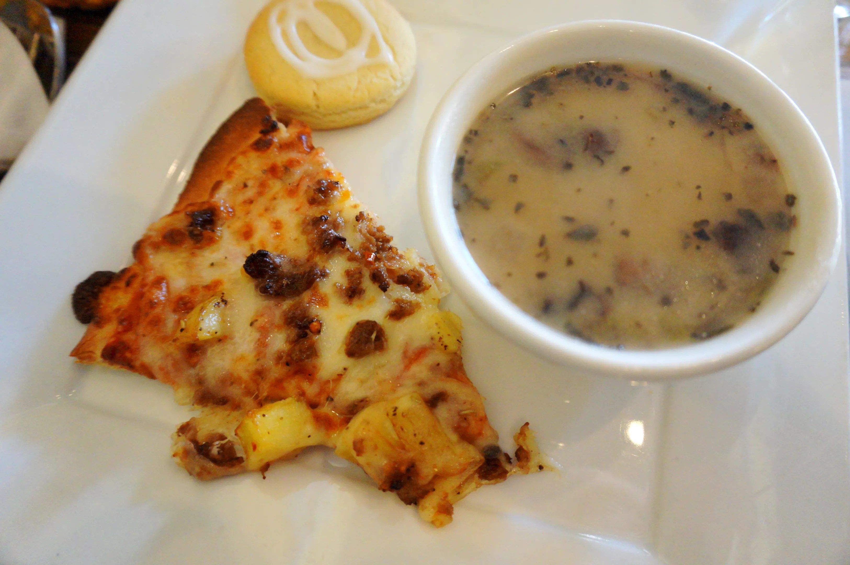 Choirizo and potato pizza, herbed mushroom soup and a fresh-baked cookie – a simple but nourishing lunch.