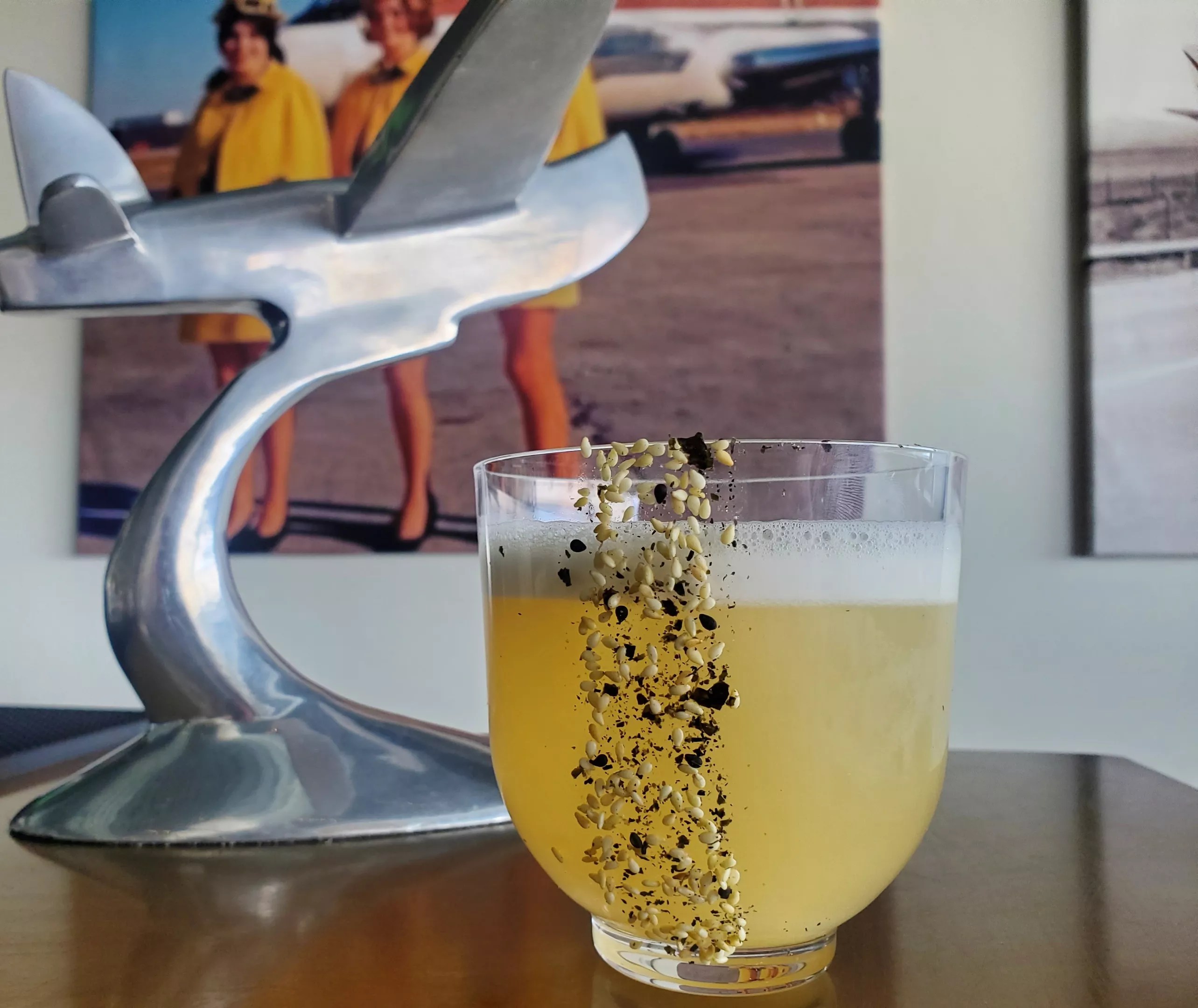 “The idea with the menu is to offer the familiar, but also something weird and wonderful at the same time,” Griffiths explains. The cocktail options are divided into two sections, beginning with lounge classics. “It’s those drinks that people think about when they think of flying and being in the airport,” he adds.