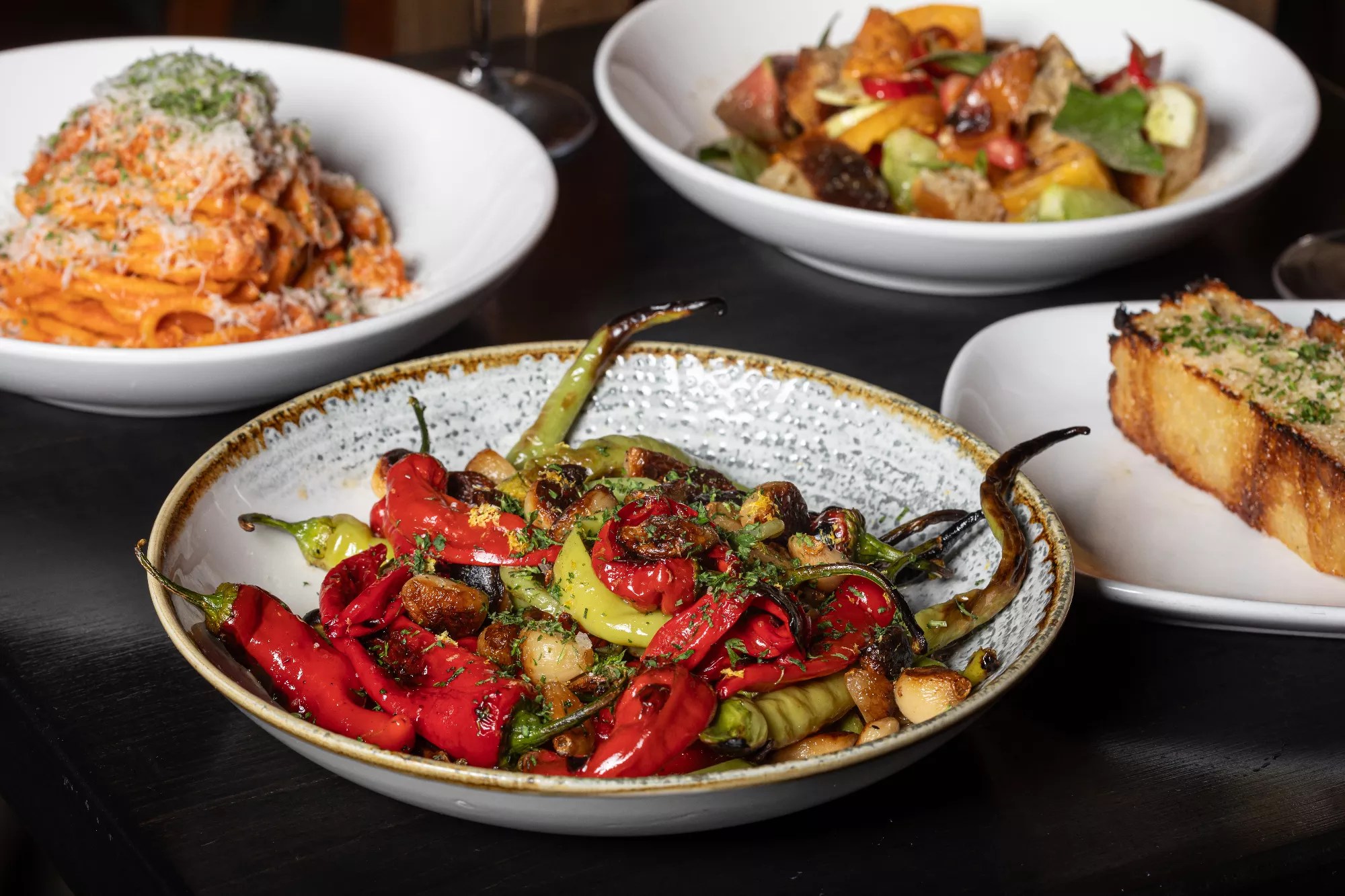 The wood-fired peppers Devtia created for Bar Dough’s current menu are made with locally-grown Turkish Sword Chile and Jimmy Nardello peppers over giardiniera aioli.