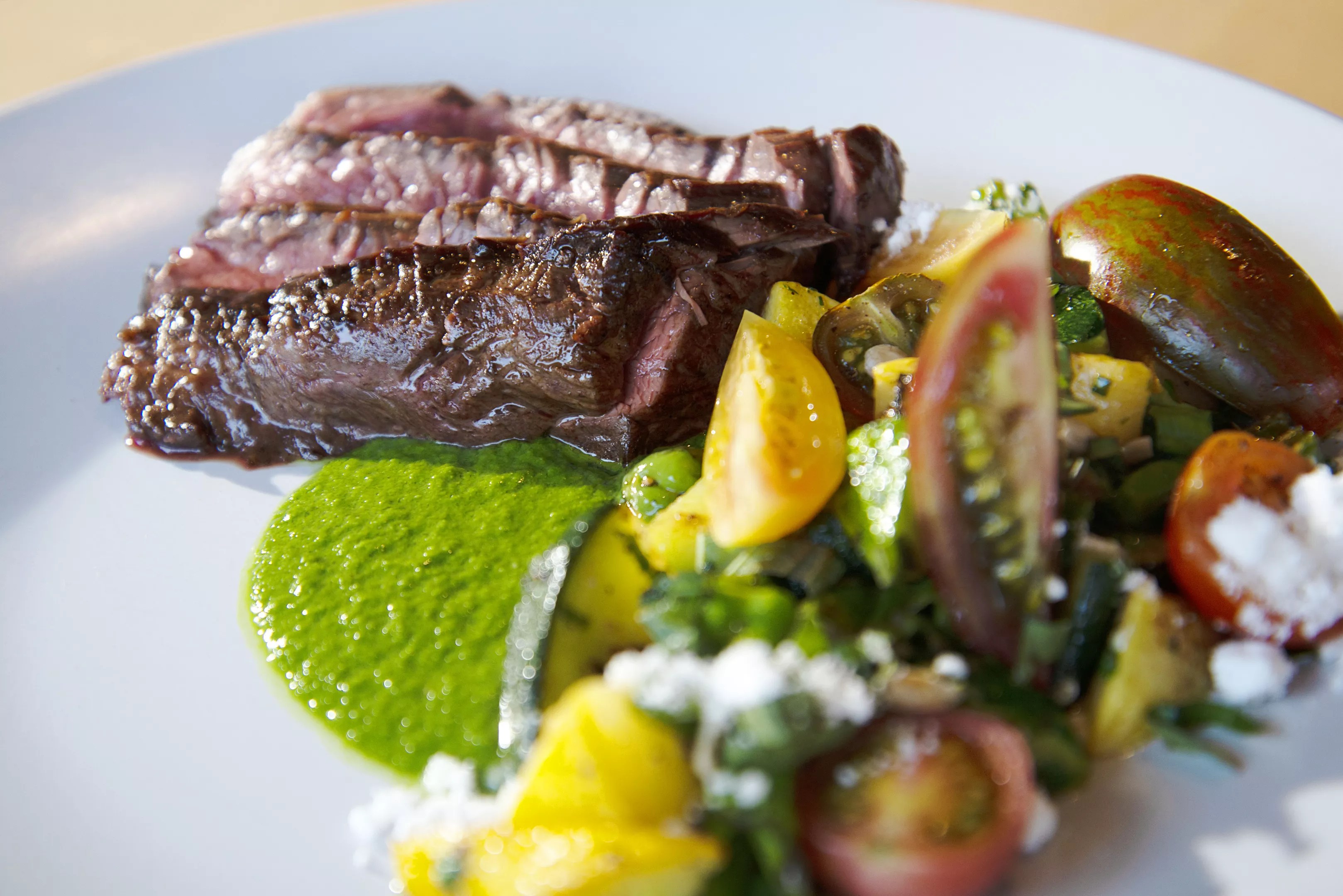 The hanger steak features Colorado summer squash, cherry tomatoes and sunflower romesco sauce. Tom Hellauer