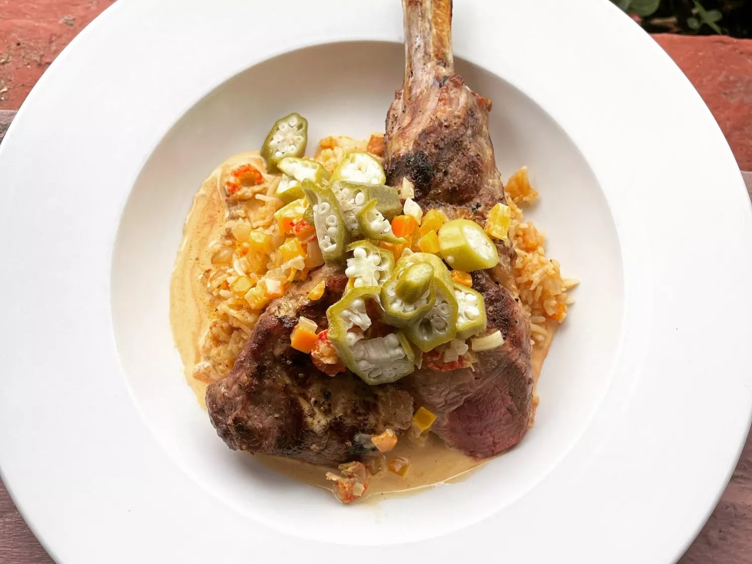 Table 6’s pork chop with pickled okra, dirty rice and crawfish gravy.