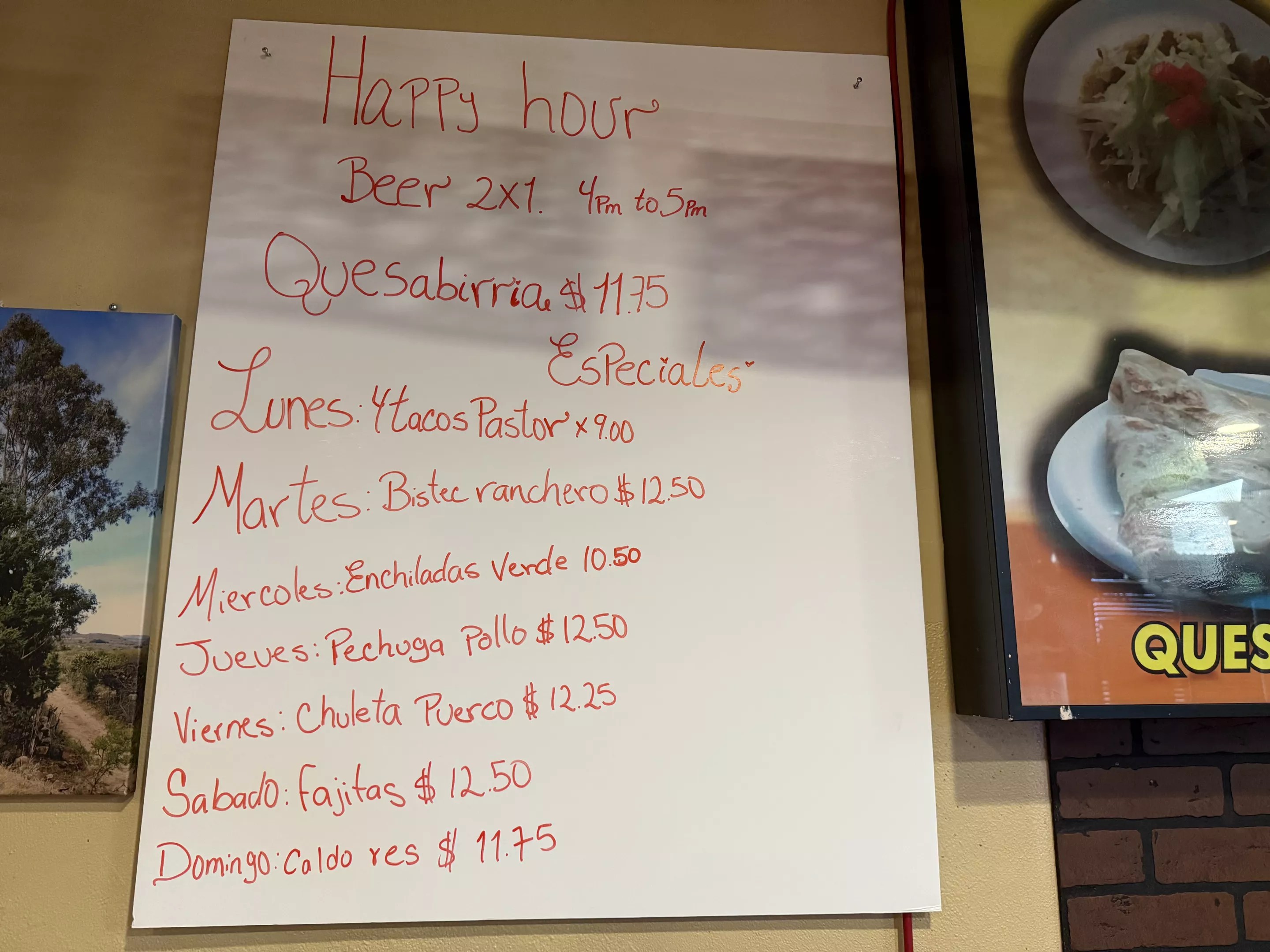 The daily happy hour specials menu at Taqueria Corona