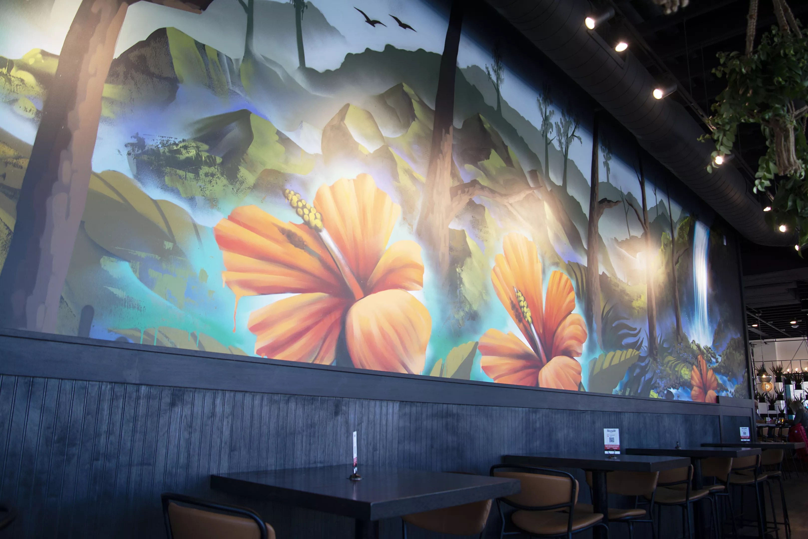 Local muralist and artist, Chad Bolsinger, completed a vibrant wall mural in Teocalli Cocina.