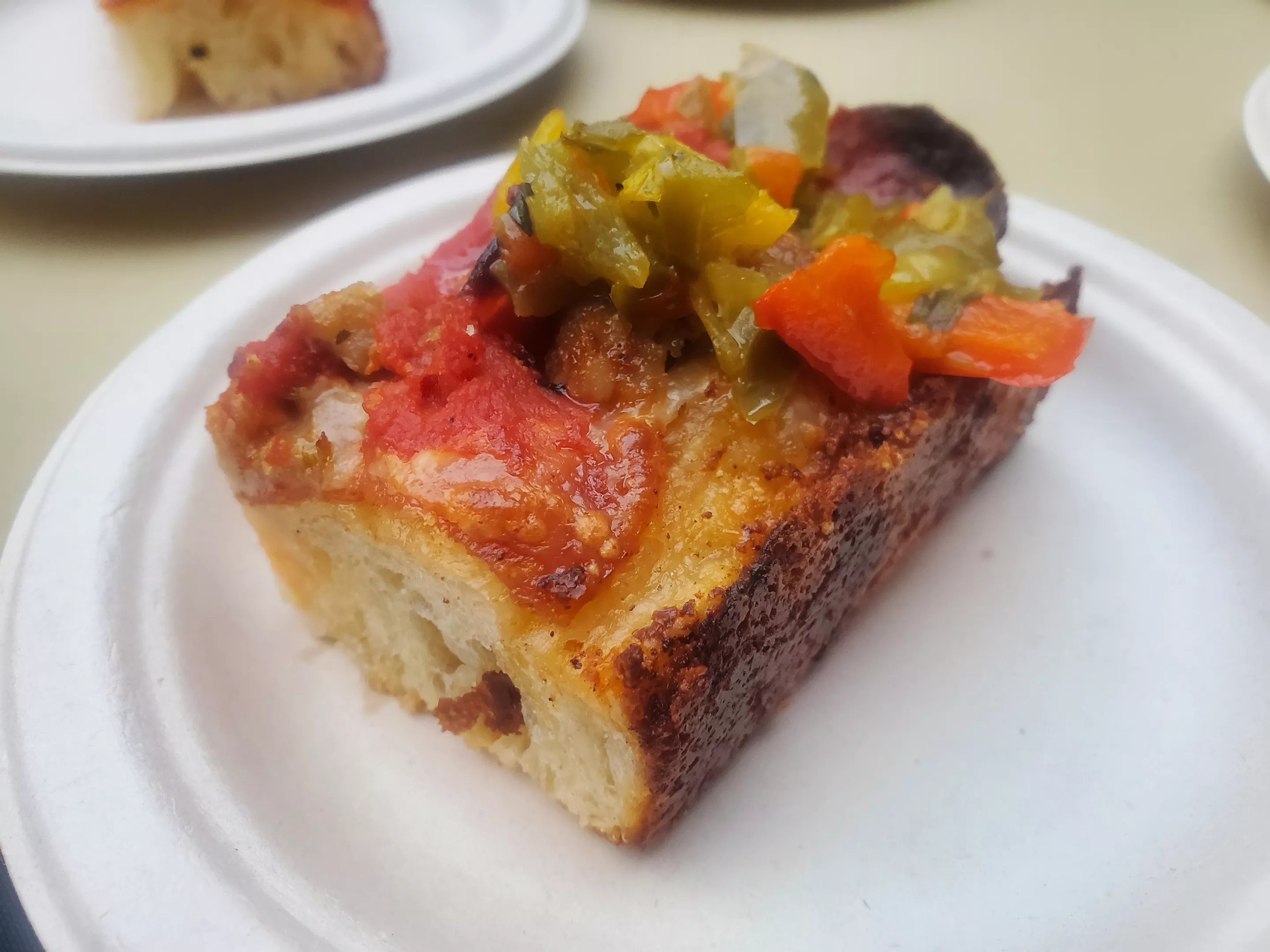 Cooking outside at a festival is a totally different game than making food in a brick-and-mortar kitchen, but newcomer Red Tops Rendezvous managed to maintain the quality of its pizza even while using a mobile oven. Everyone who saw me eating this generous sample of its Detroit-style pie asked where to find it, and then made a beeline for the Red Tops table. They weren’t disappointed.