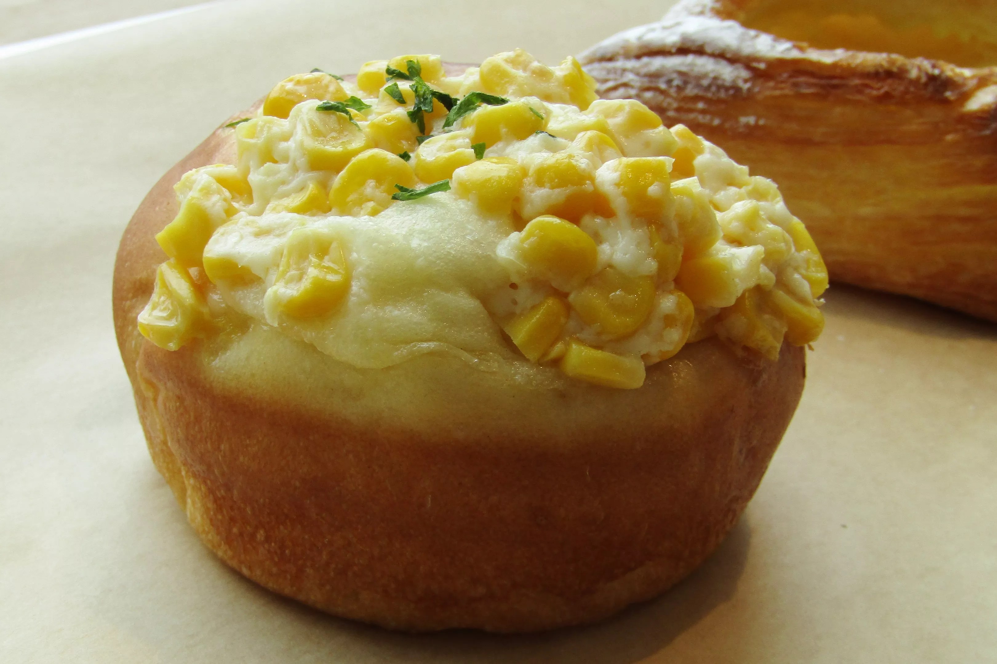 Corn and eggs top this breakfast bun.
