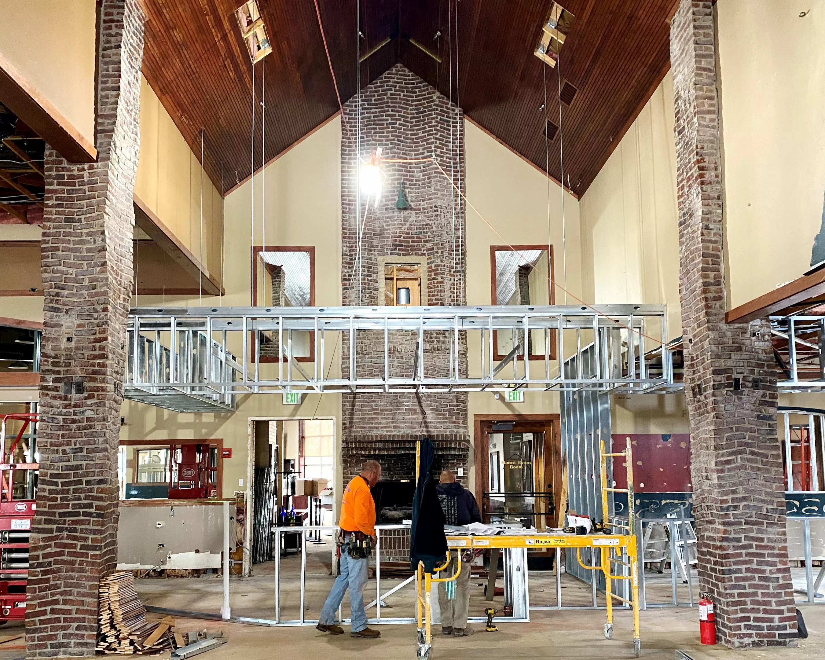The interior of the hall is almost cathedral-like in its spaciousness and layout. Vaulted ceilings come to a peak above the main dining area and again above a T-shaped bar (the only interior design element that will remain relatively untouched). Brick pillars defy gravity in a wobbly pattern ascending toward the ceiling; the bricklayer’s intentionally free-form design makes the pillars look ready to topple. Guard says they’ll be washed in white paint to add more brightness to the space. And more than two stories above the floor, skylights are being cut in the ceilings to let in the sun.