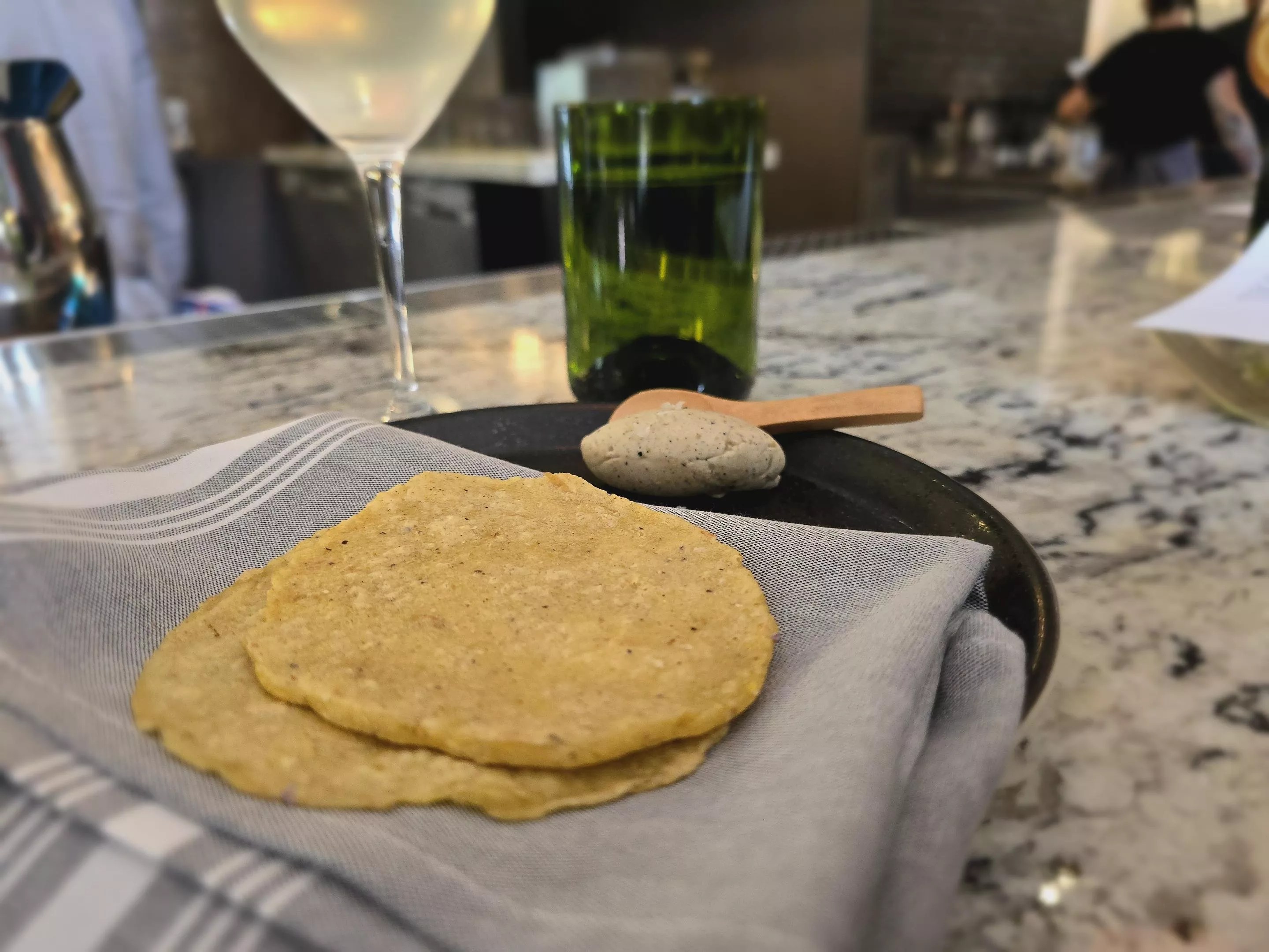 The menu is rooted in ancestral Mexican dishes and techniques, heavily featuring masa, which has its own section on the menu. Nixtamalized corn (the raw kernels soaked in ash and water for hours before being ground and mixed with water) creates the paste known as masa — an ancient bedrock food staple in the Americas for centuries. Xiquita presents masa as its first impression in the form of a welcome plate of tortillas, fresh from the nearby comal (the flat top griddle where the masa is pressed and briefly cooked) and still warm, served with a dollop of jalapeño butter.